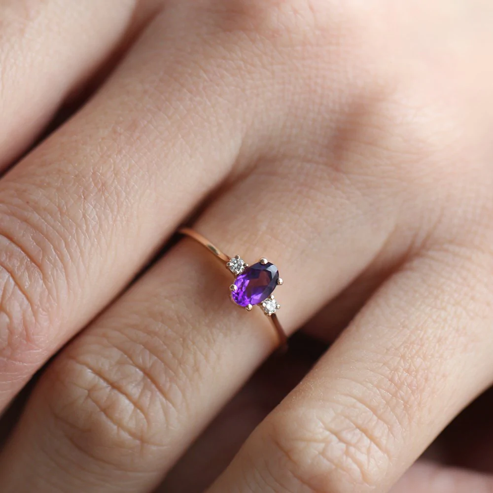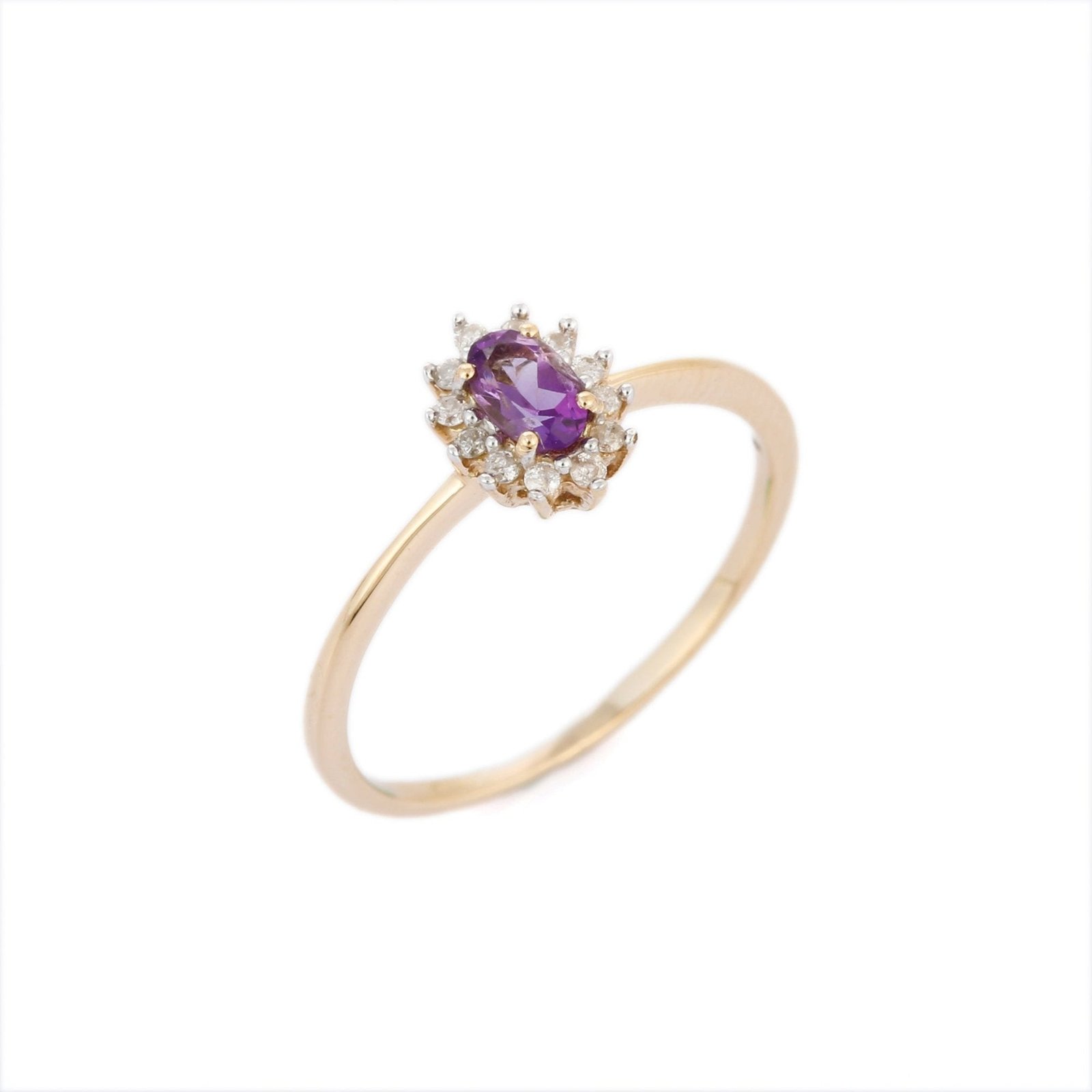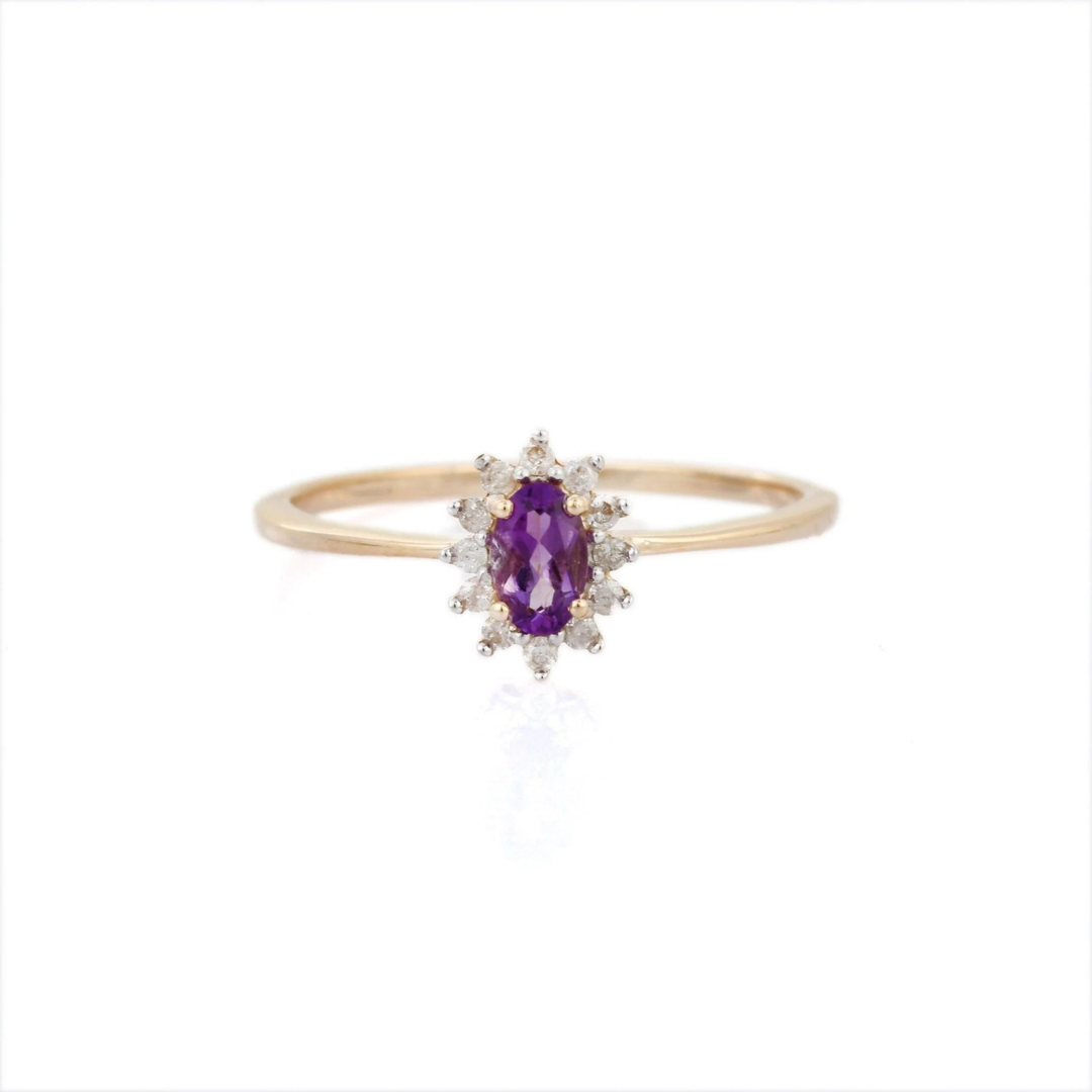 Graceful 14K solid gold ring featuring an oval-shaped amethyst accented with sparkling diamonds—crafted for timeless elegance and vibrant charm.