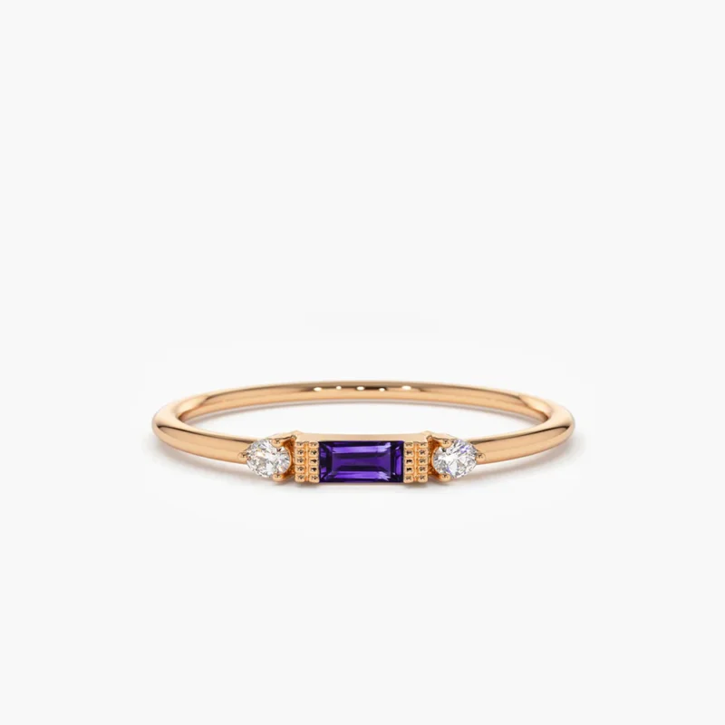 18K Solid Gold Baguette Amethyst With Diamond Ring