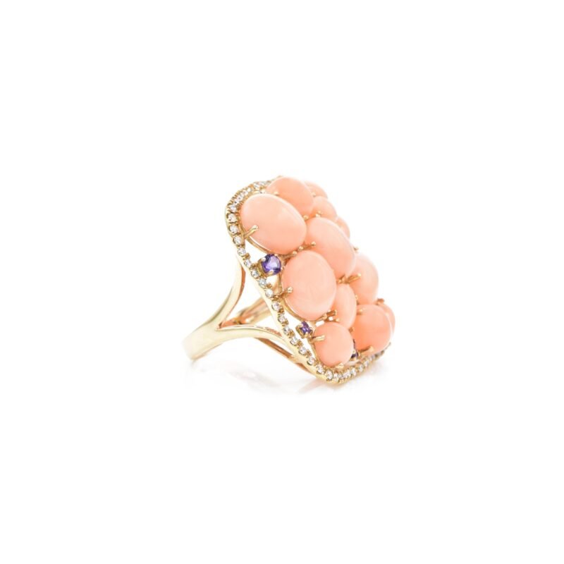 18K Solid Gold Coral and Amethyst with Diamond Ring