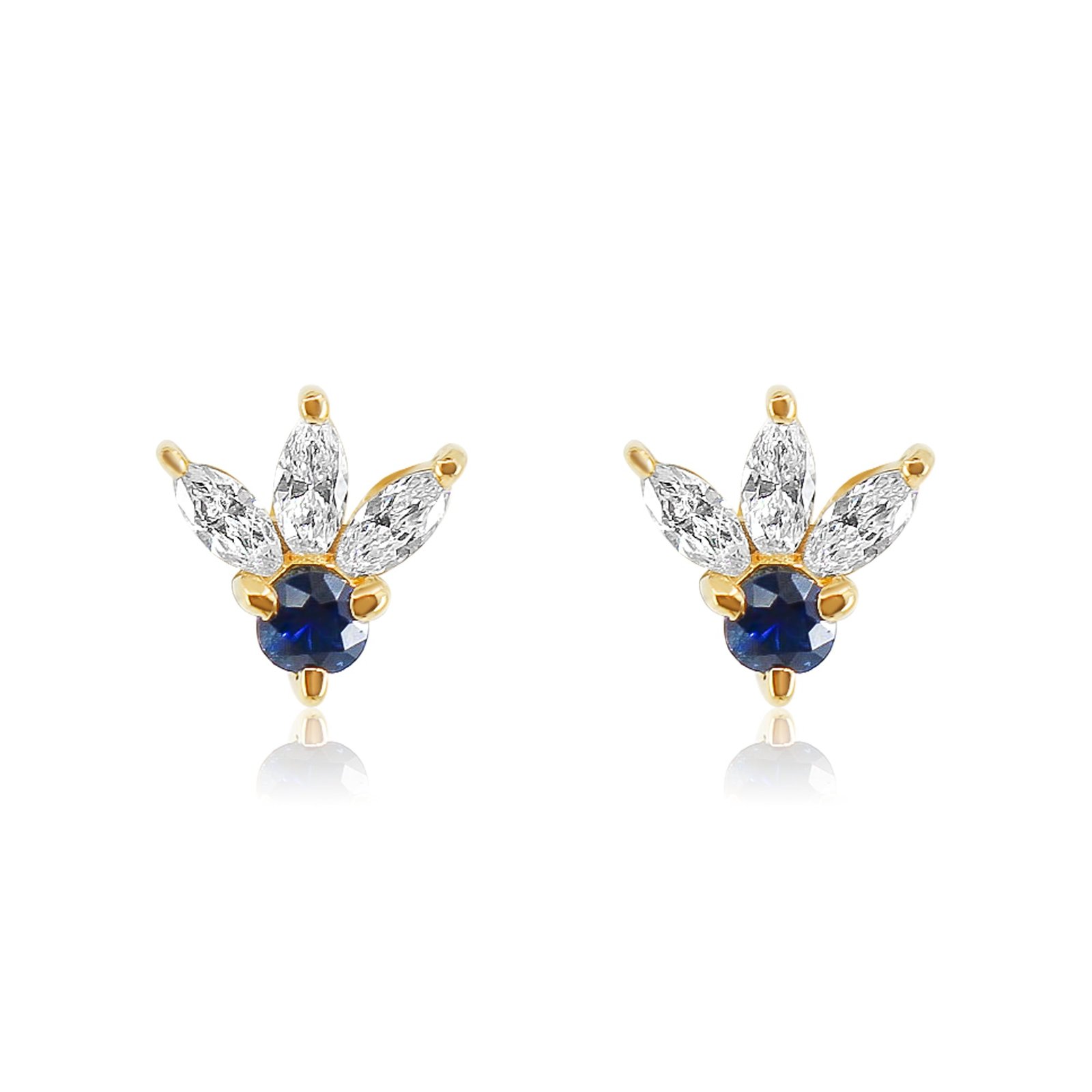 Graceful 14K solid gold stud earring in a lotus design featuring blue sapphires and diamonds—crafted for serene elegance and radiant sparkle.