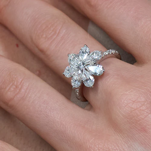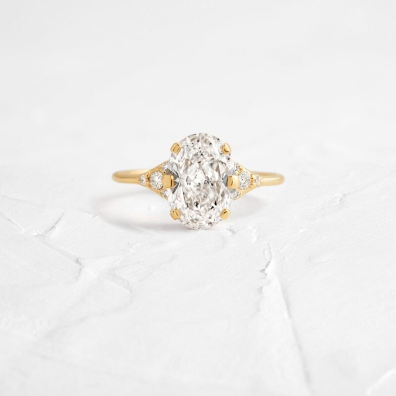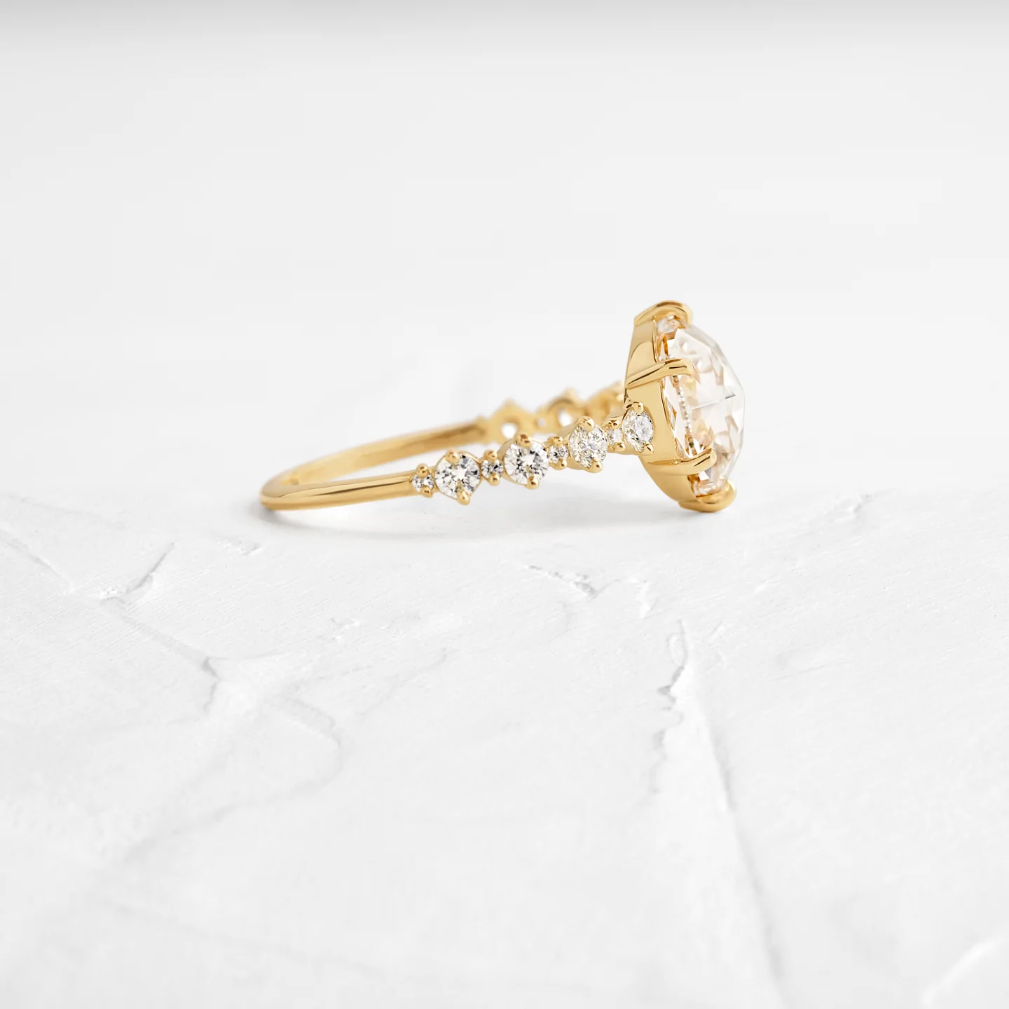 A 2.2ct lab-grown diamond engagement ring, featuring a 2ct Super Cut center stone with round and marquise side diamonds, set in 14K solid gold.
