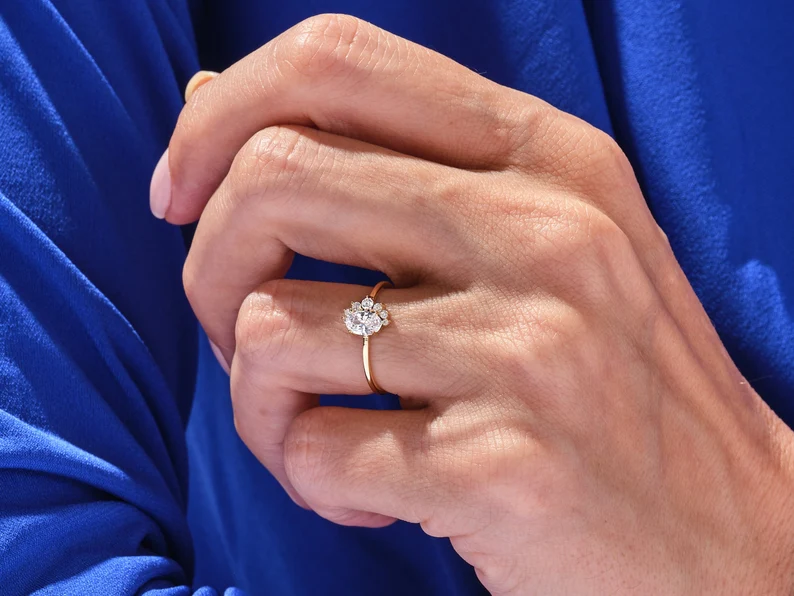 0.5 Sunburst Natural Dimond Engagement Ring /Vintage Halo Oval Cut Promise Ring