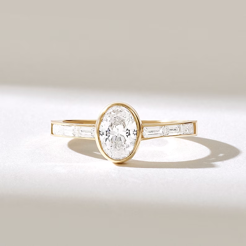 14k Gold Bezel Solitaire Natural Diamond Ring Oval Engagement Ring with Baguette Diamond