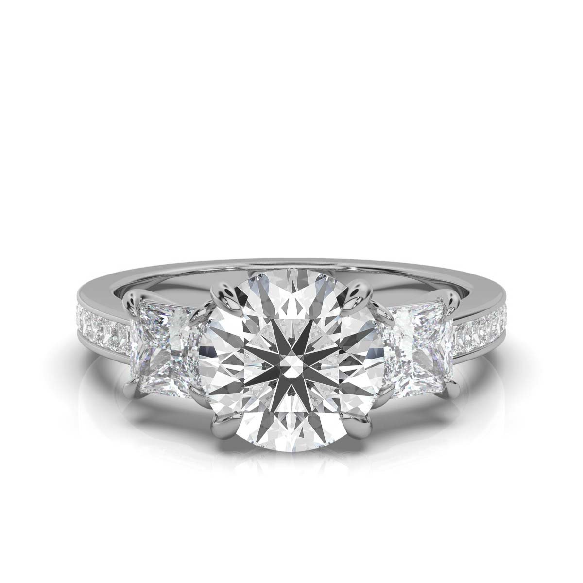A stunning 18k solid gold three-stone engagement ring featuring a 2 ct round lab-grown diamond with princess-cut side stones (0.96 ctw). Available in white, rose, and yellow gold.