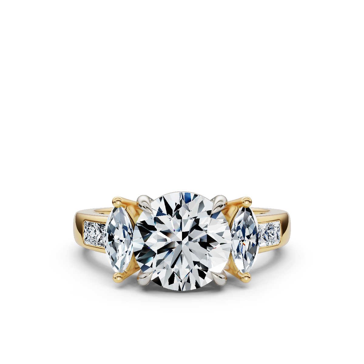 A 18k gold three-stone ring featuring a 2ct super-cut round lab-grown diamond, accented by 1.19ct of round and emerald-cut side diamonds. Available in white, rose, and yellow gold.