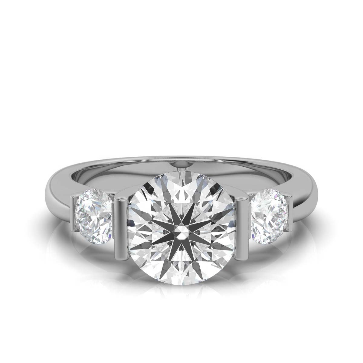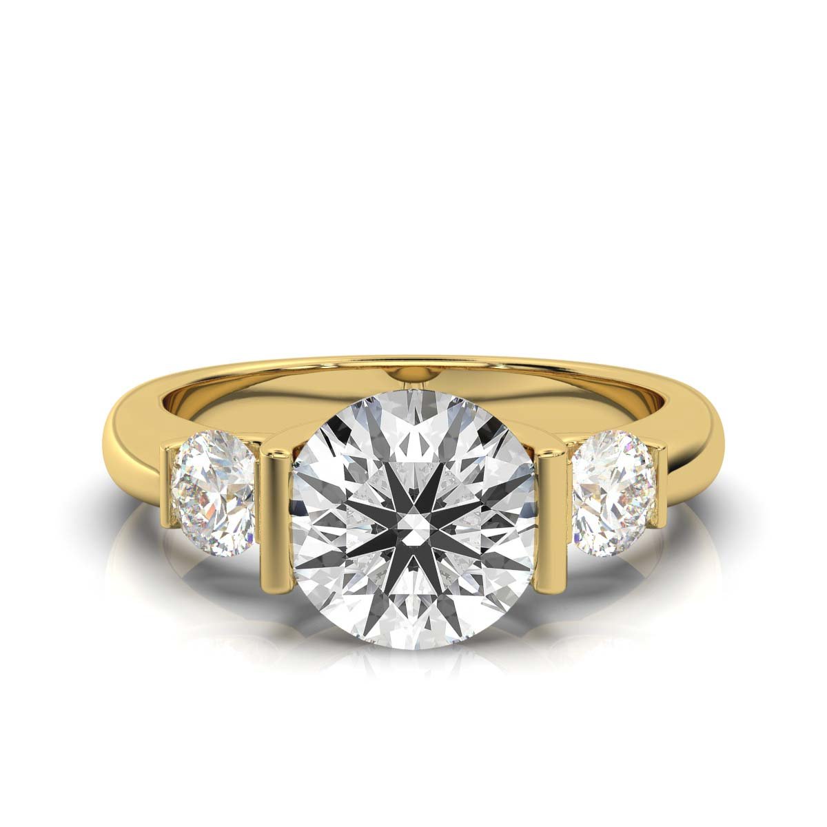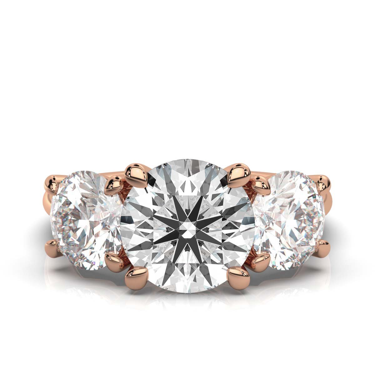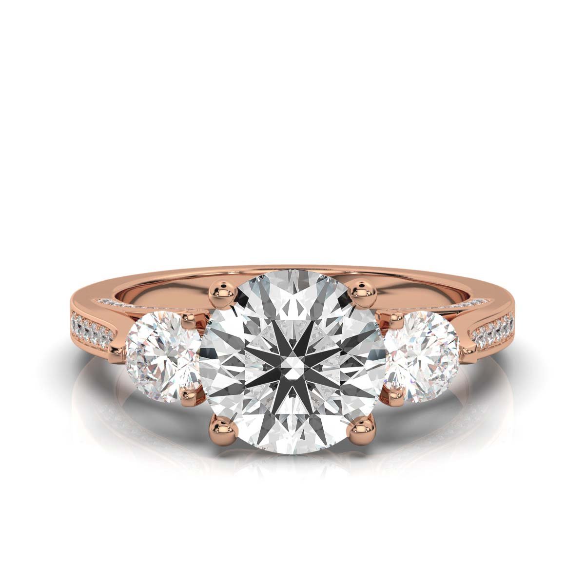 A stunning 18k solid gold three-stone engagement ring, featuring a 2-carat round lab-grown diamond with 1.25 carats of side diamonds. Available in white, rose, and yellow gold.