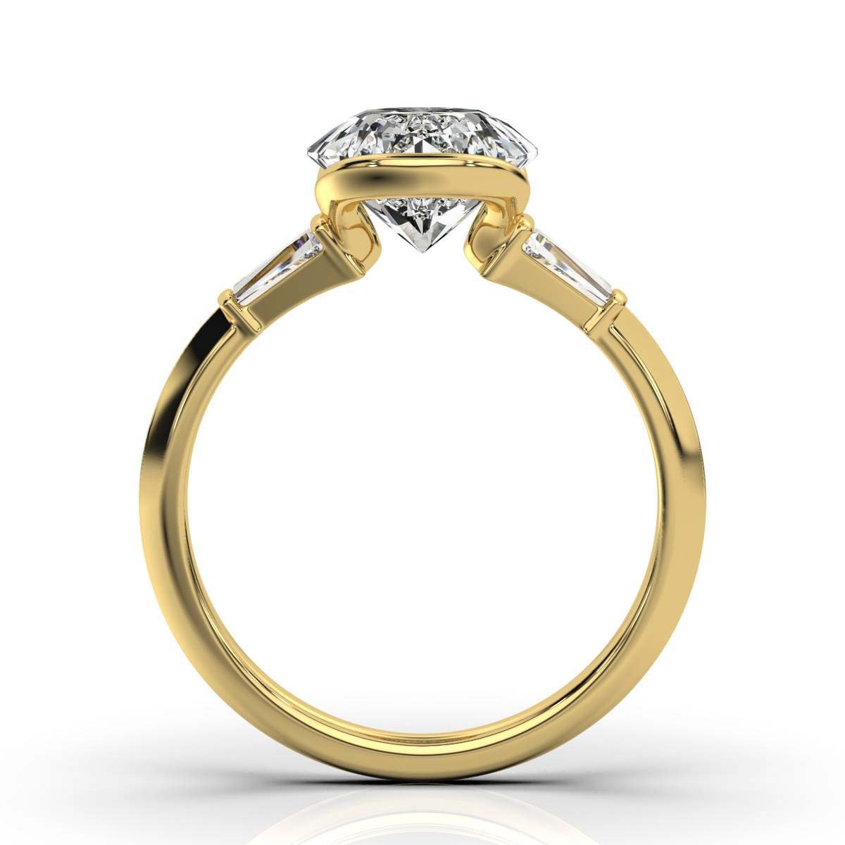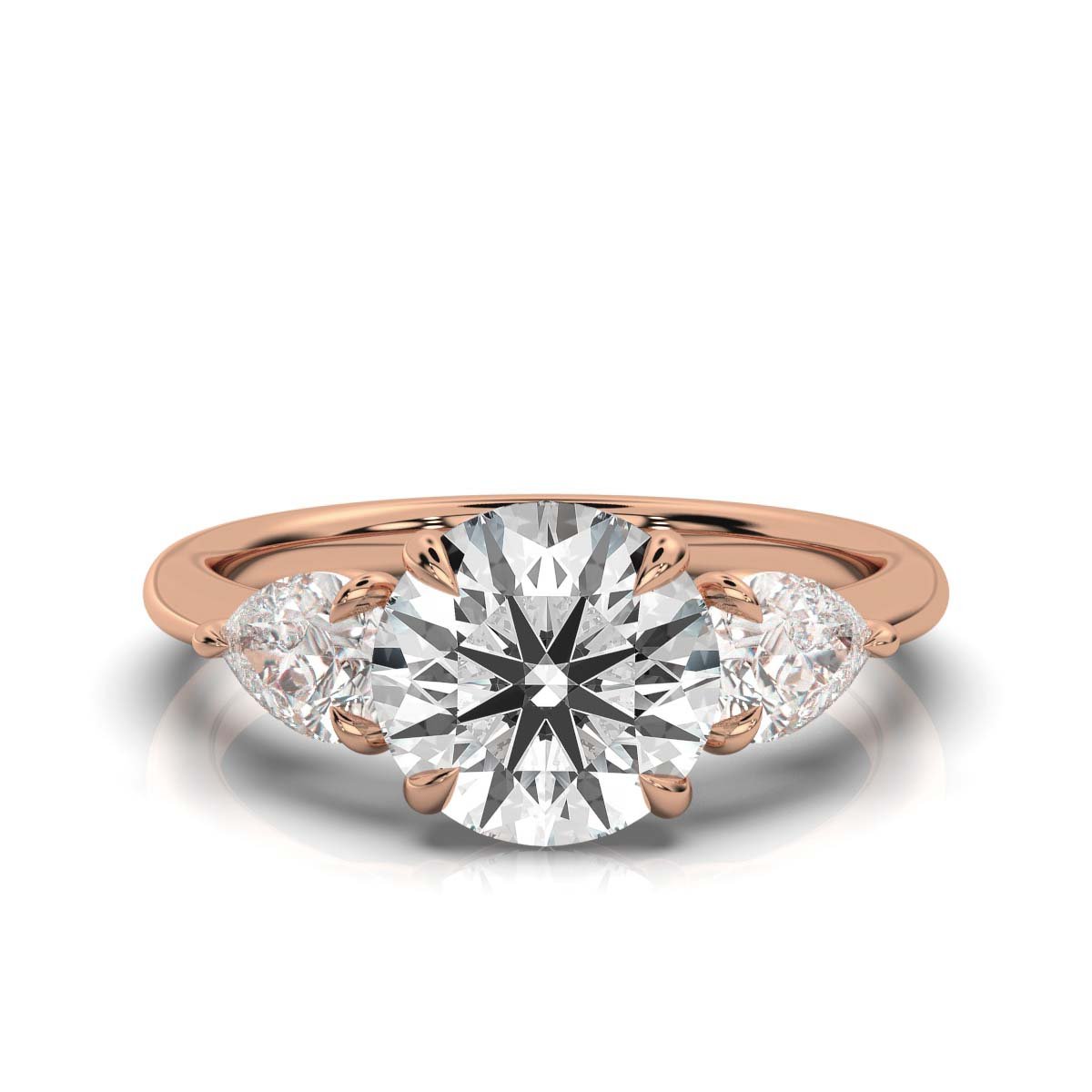 A 2 ct round lab-grown diamond engagement ring, enhanced by two pear-shaped diamonds (0.76 ct total) in 18k gold. IGI & BIS certified.
