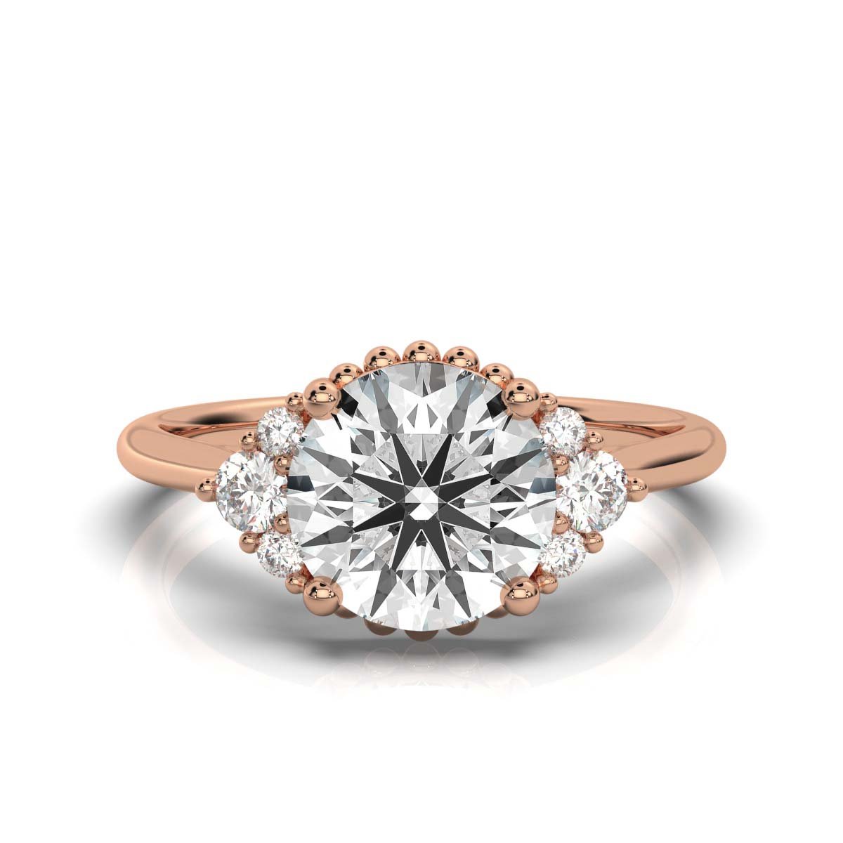 This 14K Gold Milgrain Lab-Grown Diamond Ring features a 2ct F VS2 Super Cut round diamond, complemented by 0.2ct of side stones with vintage milgrain detailing. Available in white, rose, and yellow gold, it is IGI & BIS hallmarked for authenticity.