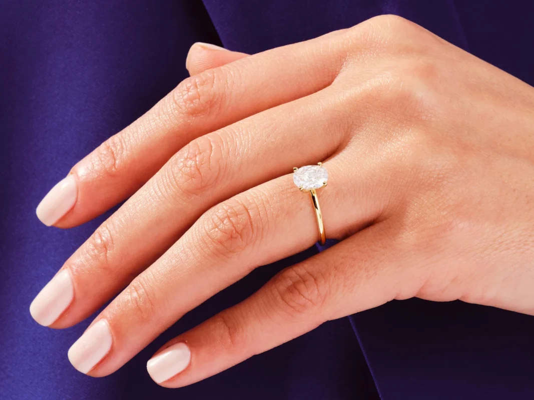 This 14K solid gold ring features an oval moissanite diamond set east-west in a secure 6-prong design—offering a chic twist on timeless sophistication.