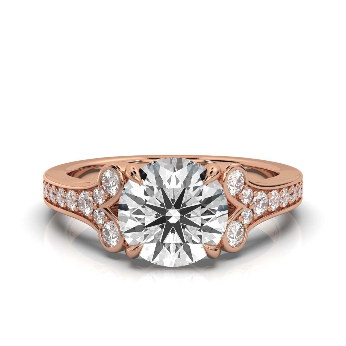 Embrace nature’s elegance with the 14K Solid Gold Nature-Inspired Lab-Grown Diamond Ring featuring a stunning 2 ct round Super Cut diamond and 32 accent diamonds in a delicate, organic design. Available in White, Rose, and Yellow Gold.
