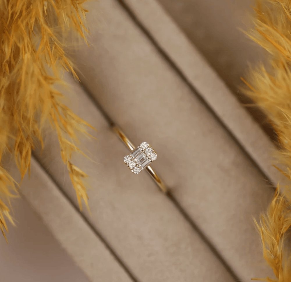 14K gold ring with a 0.13 ctw baguette-cut diamond (GH/VS-SI), set on a 1.3 mm band. Minimalist, stackable, BIS hallmarked & GIA certified.