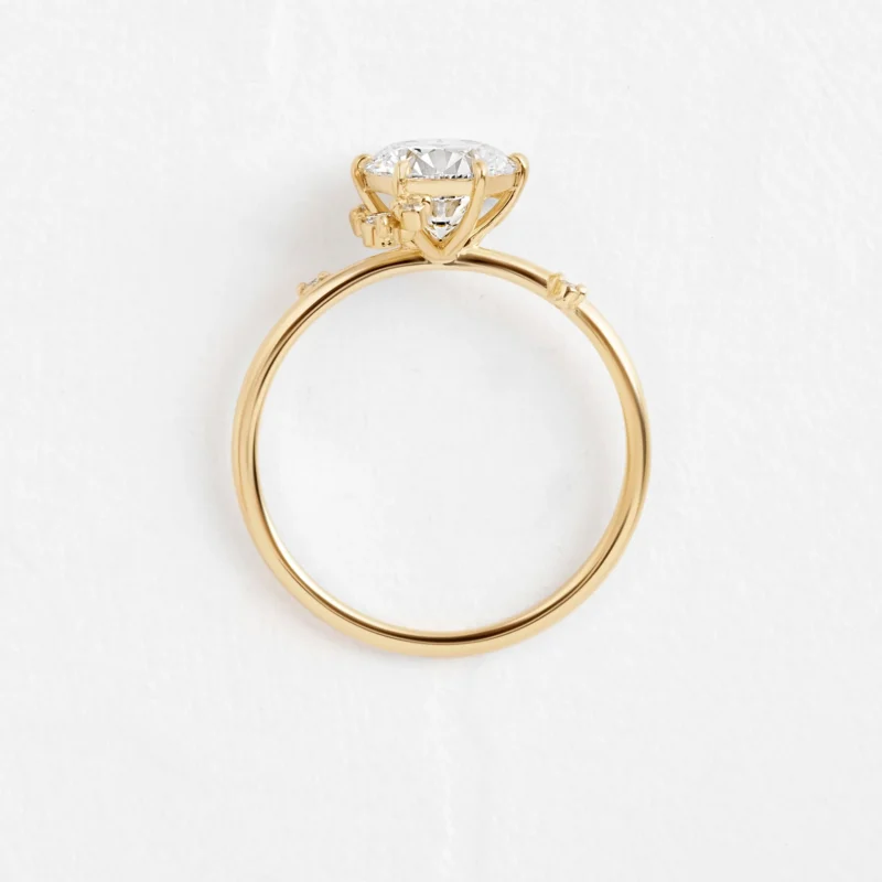 This 14K gold shared prong ring features a 2 ct round lab-grown diamond (F color, VS2 clarity, Super Cut) with six round and pear-shaped side diamonds (0.15 ctw) for added brilliance. Available in white, rose, or yellow gold.