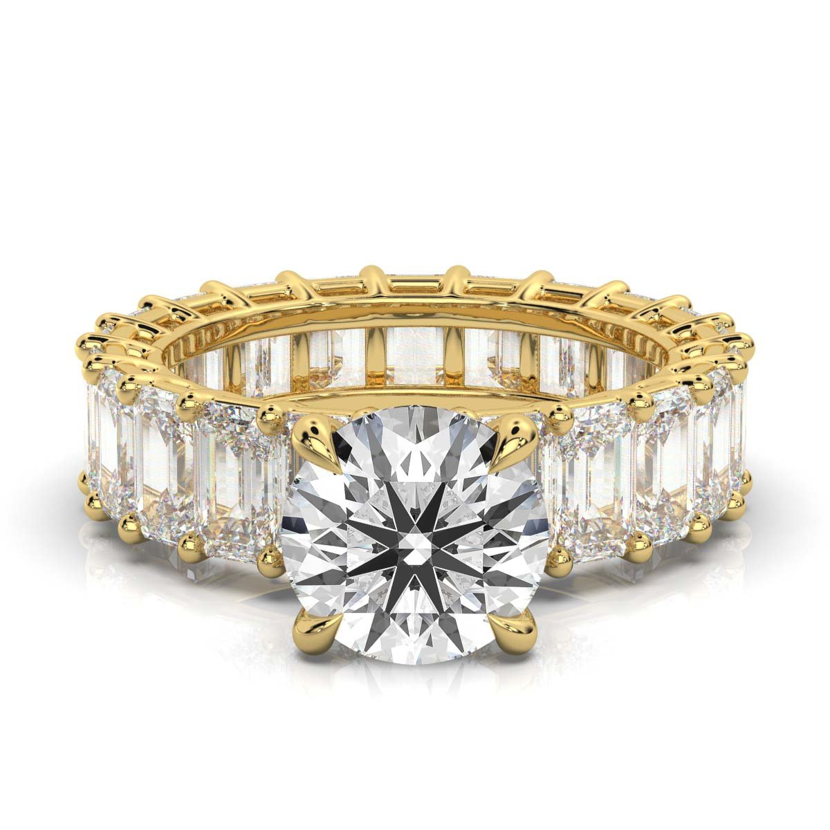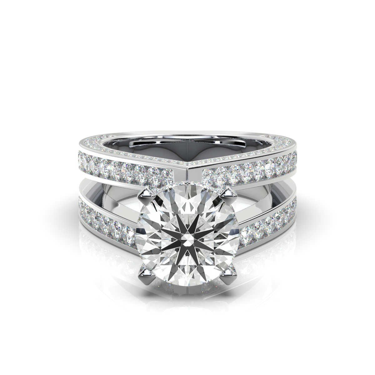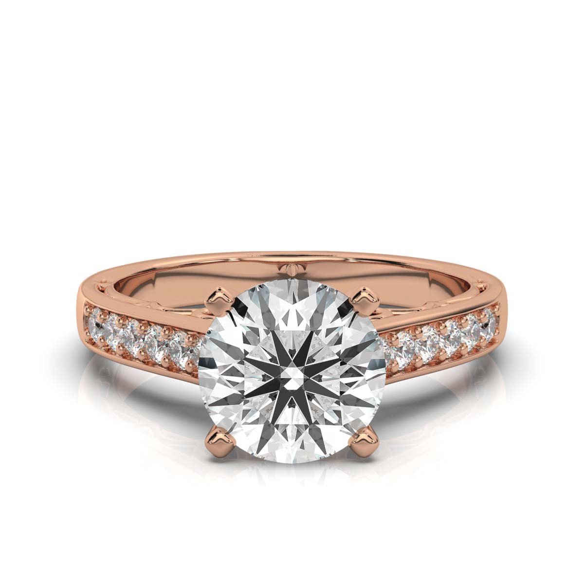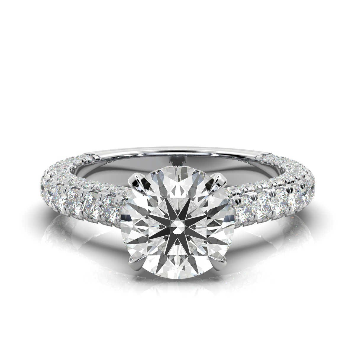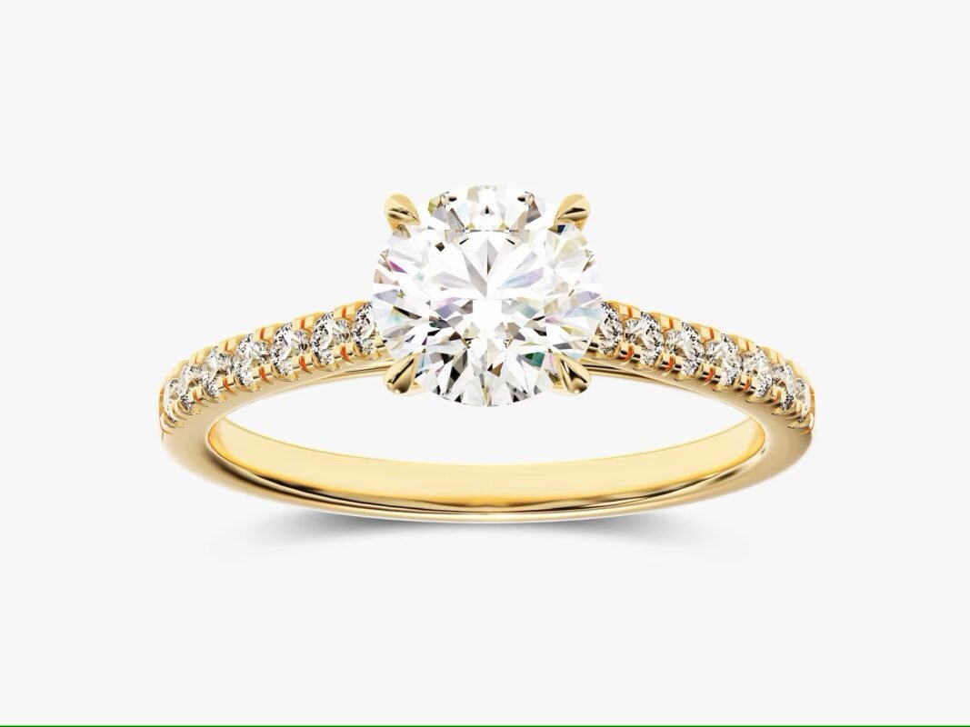 A luxurious 2 ct round-cut lab-grown diamond ring with a pavé-set band featuring 40 sparkling side diamonds (2 ct total) in 14K solid gold. IGI & BIS Hallmarked for quality and authenticity.