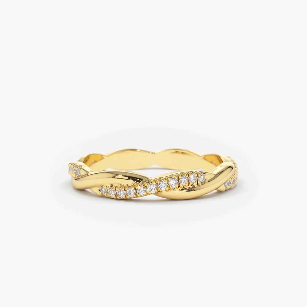 A stunning 14K gold woven braid eternity ring featuring D color VVS1 Moissanite diamonds in a micro-pavé setting. Available in White, Rose, and Yellow Gold. BIS Hallmarked.