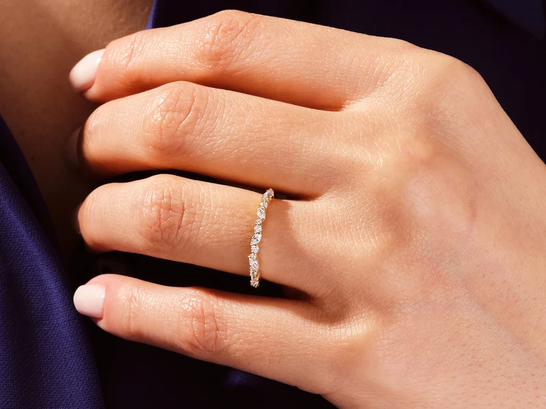 14K Solid Gold Bezel Set Marquise Natural Diamond Wedding Ring Thin Gold Stackable Ring