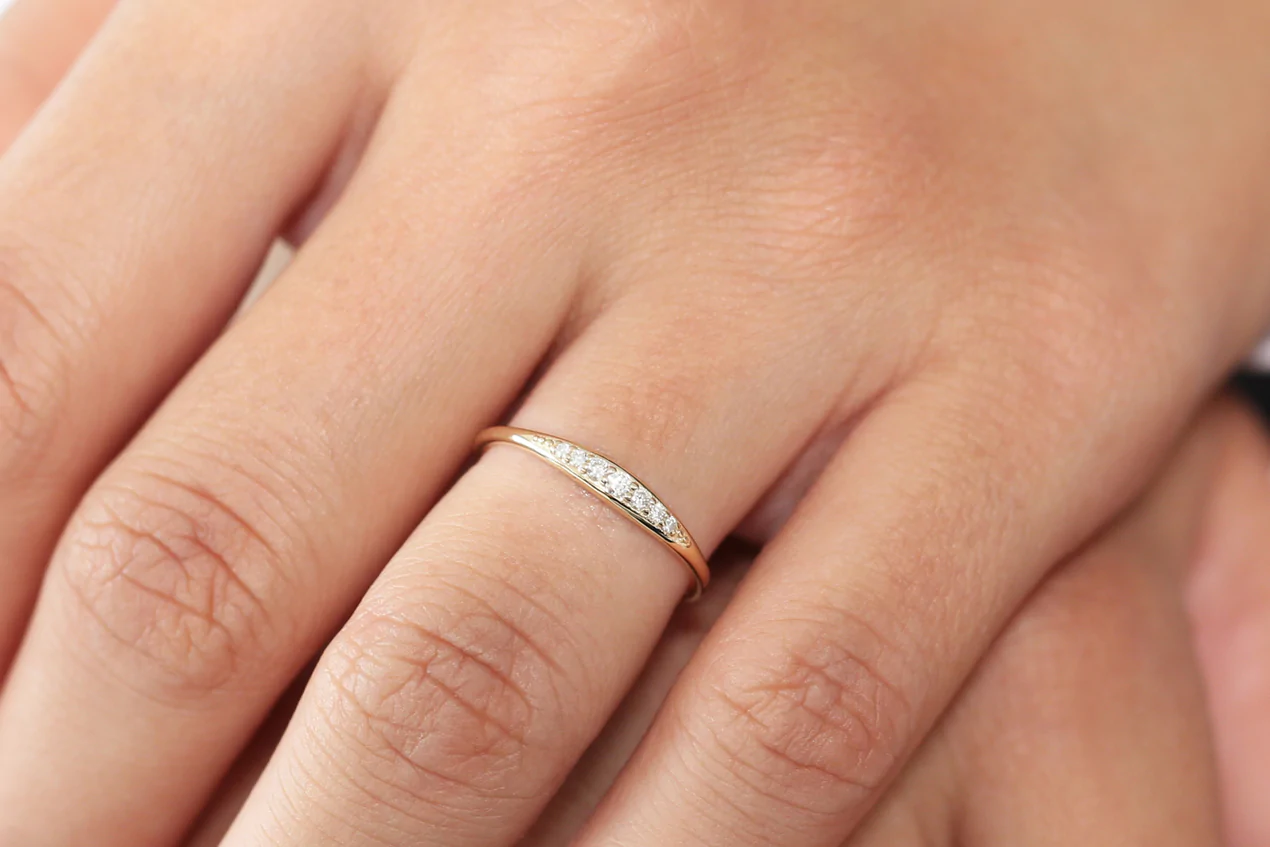 14K gold curved band with a single 0.02 ct natural diamond. Minimalist, stackable, and certified. Available in white, yellow, or rose gold.