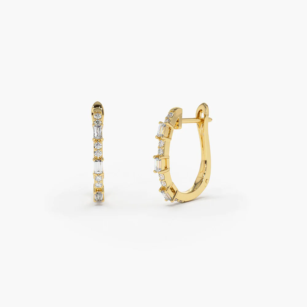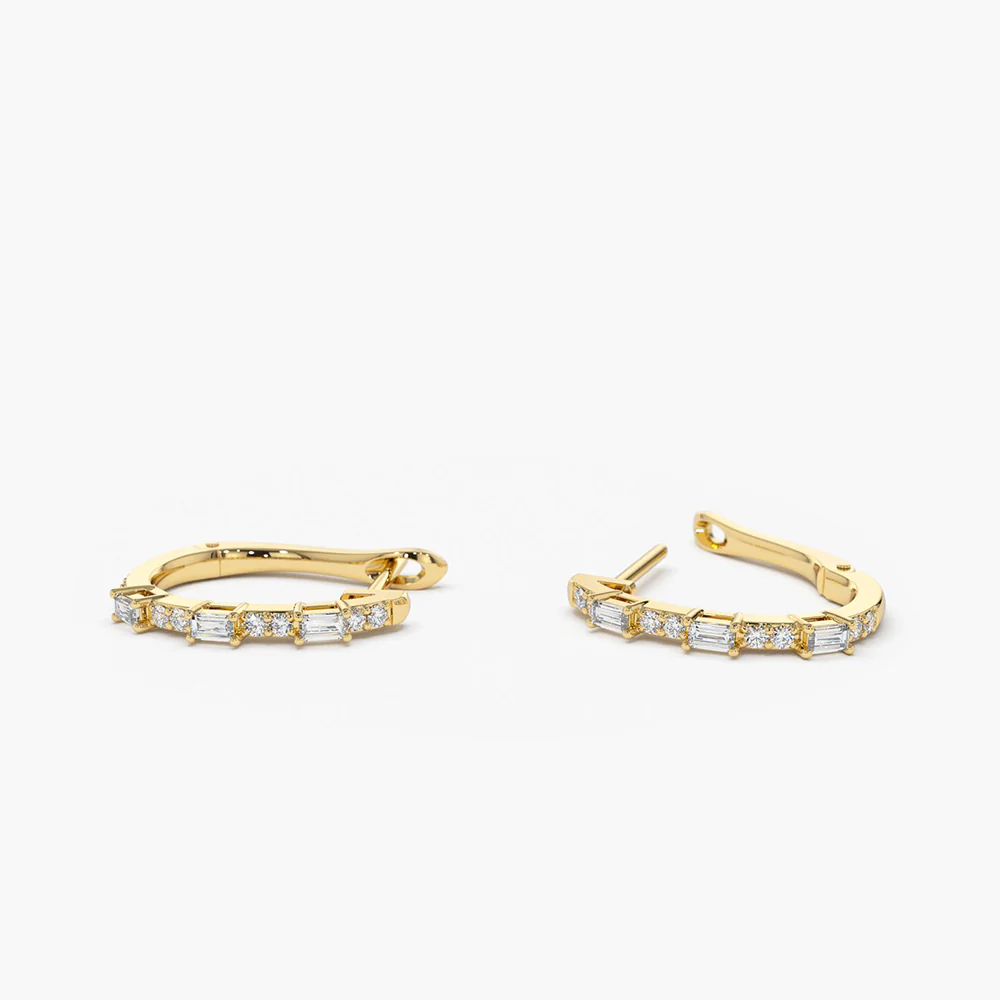 “Elegant 14K Gold Baguette and Round Moissanite Diamond Earrings – a beautiful combination of baguette and round Moissanite diamonds, perfect for a classic, radiant style.”