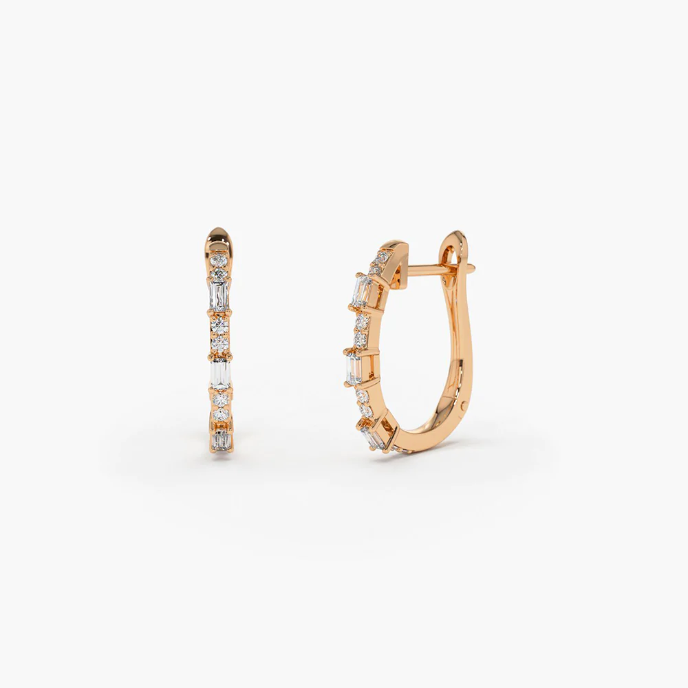 Elevate your elegance with our 14K Gold Baguette and Round Moissanite Diamond Earrings, a perfect blend of modern sophistication and timeless sparkle. Expertly crafted in 14K solid gold, these exquisite earrings are available in White, Rose, and Yellow Gold, allowing you to choose the perfect tone to complement your style.