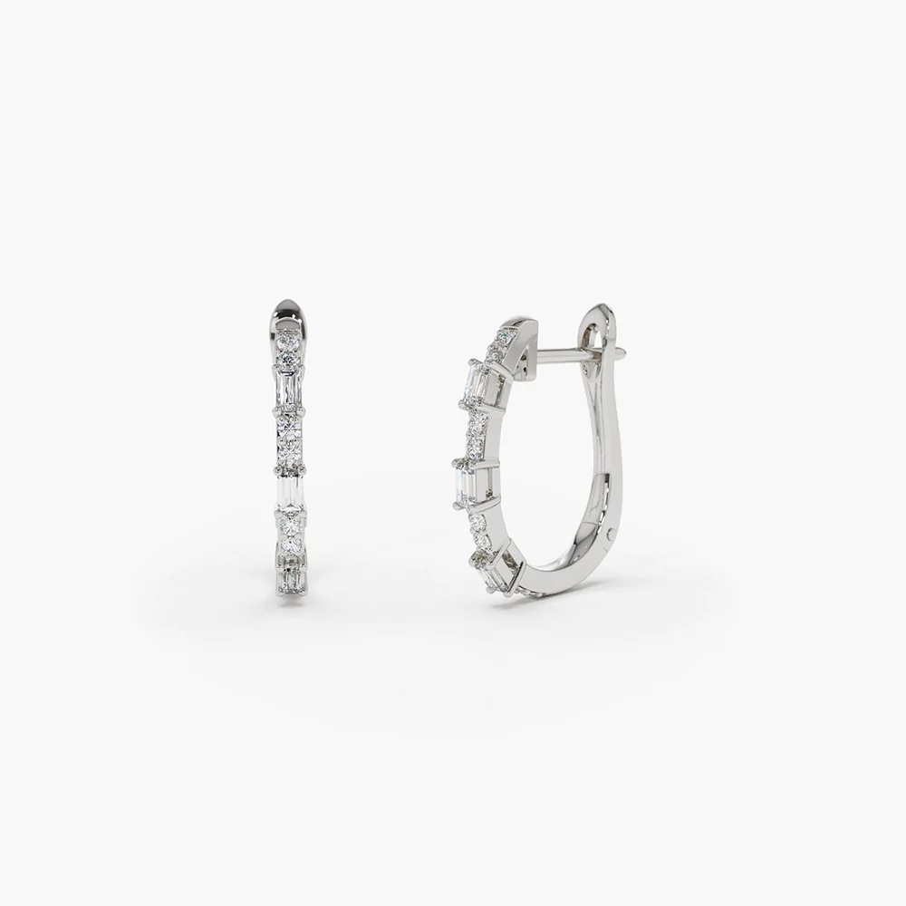 Designed for those who appreciate intricate detailing, these earrings feature a stunning combination of baguette-cut and round Moissanite diamonds. The D color and VVS1 clarity of each Moissanite stone ensure exceptional brilliance, while the unique mix of shapes creates a striking and elegant contrast. Whether you’re dressing up for a special occasion or adding a refined touch to your everyday look, these earrings are a versatile must-have.