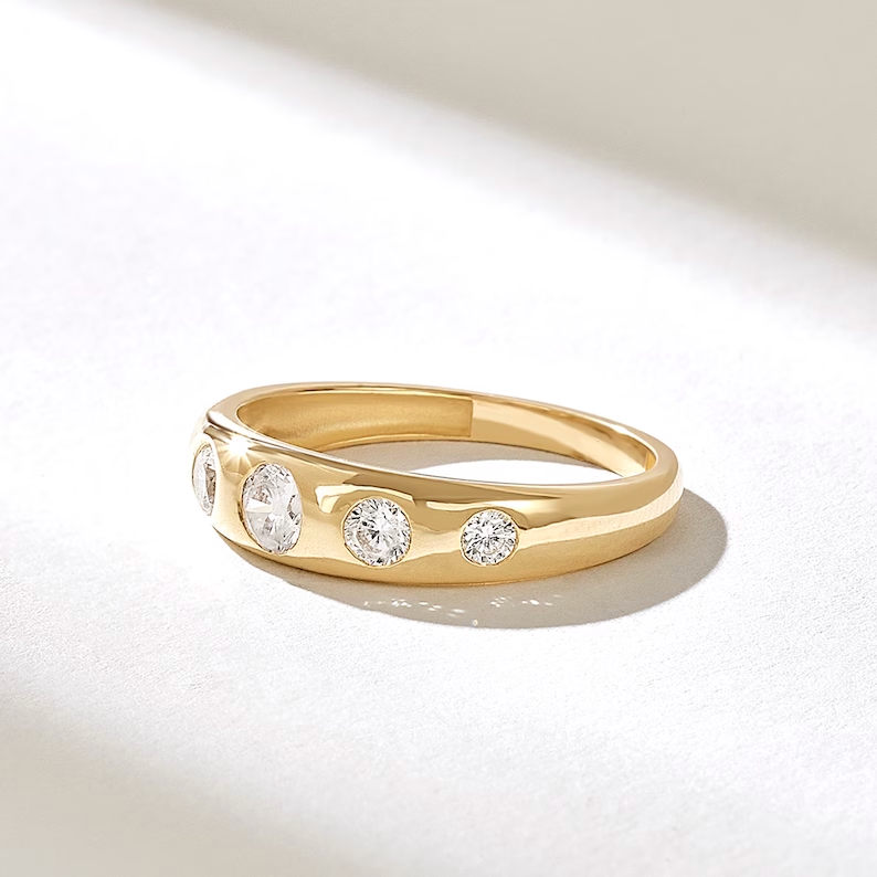- Product Name: 14k Gold Bezel Diamond Wedding Ring | Chunky Dome Bridal Band with 5 Round Stones
