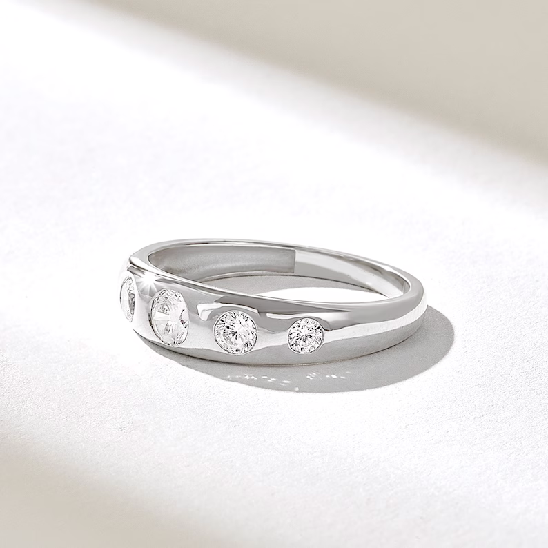 14k Gold Bezel Moissanite Diamond Wedding Ring: Chunky Dome Bridal Band with 5 Round Stones