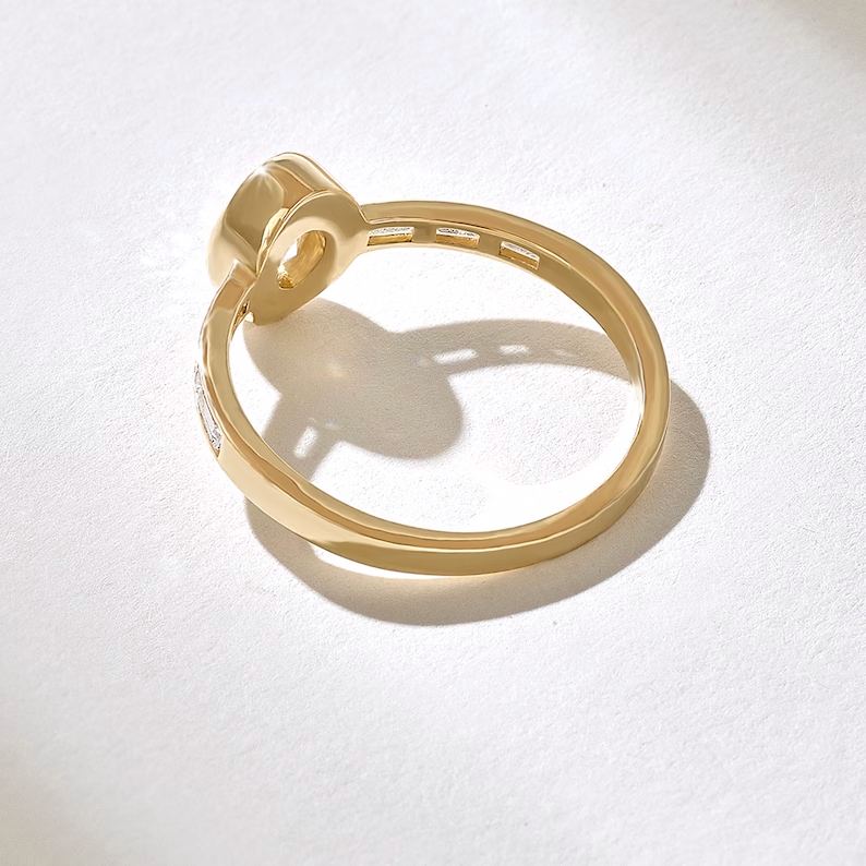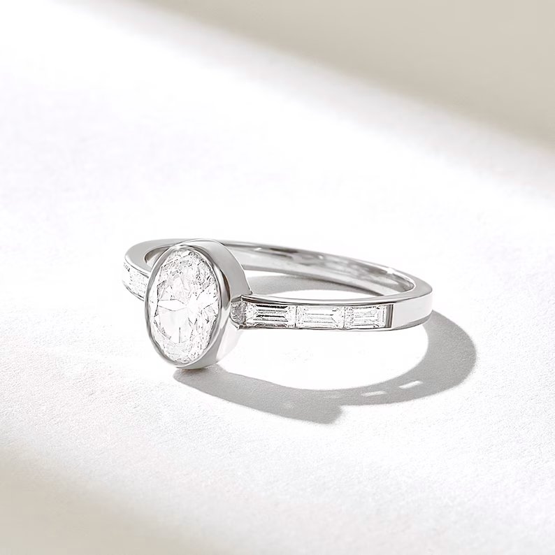 14k Gold Bezel Solitaire Natural Diamond Ring Oval Engagement Ring with Baguette Diamond