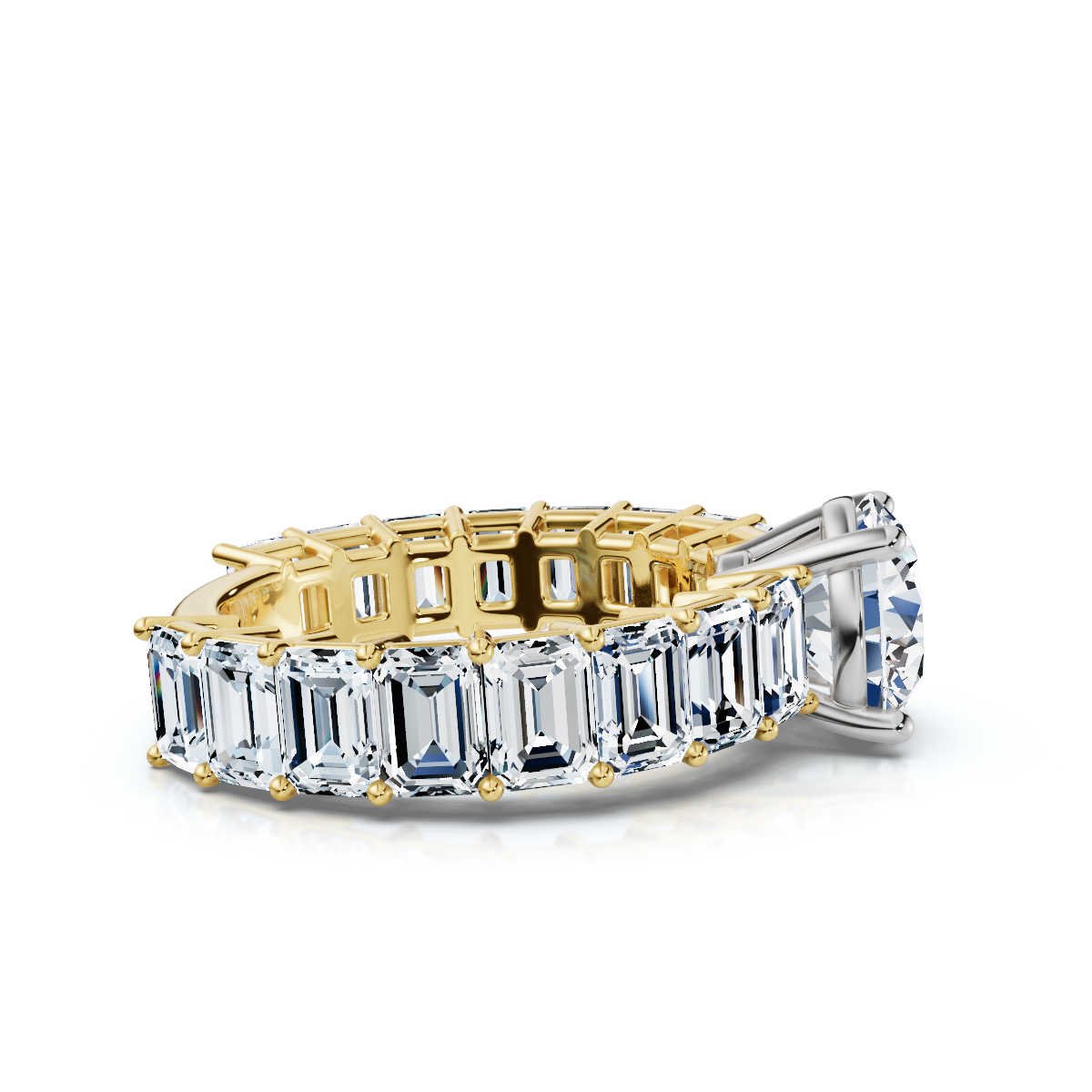 Enhancing its elegance, 4.8ct of emerald-cut Moissanite side stones create a dazzling display of light and dimension, adding depth and luxury to this exquisite piece. Crafted in solid 14K gold, this ring is available in White, Rose, and Yellow Gold, offering versatility to suit your personal style.