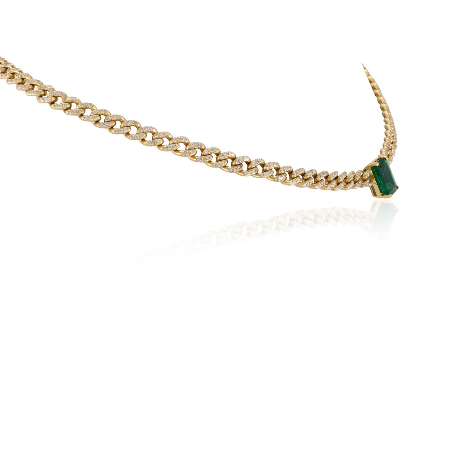 Weighing 25.09 grams, this curb chain choker necklace offers a substantial yet comfortable feel, making it ideal for everyday wear or special occasions. Measuring 14 inches in length and 10.33 mm in width, the necklace is designed to sit elegantly on the neckline, adding a touch of luxury to any outfit. The elegant design ensures that the emerald and diamonds remain the focal points, allowing their beauty to shine through.