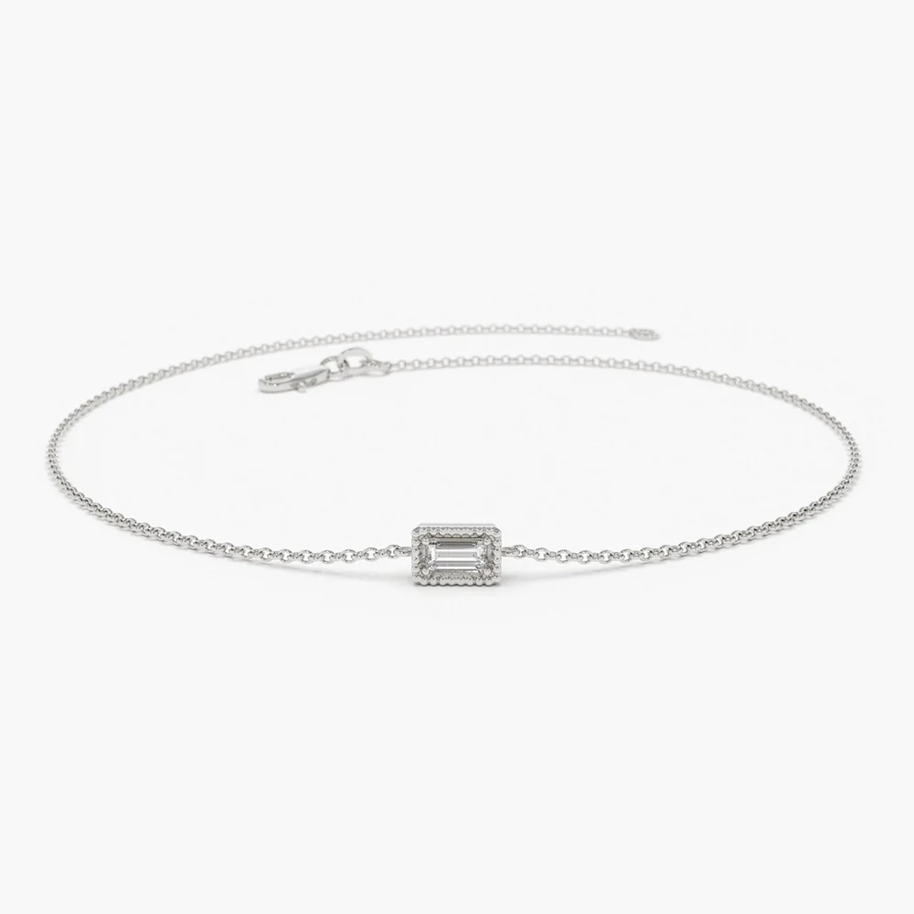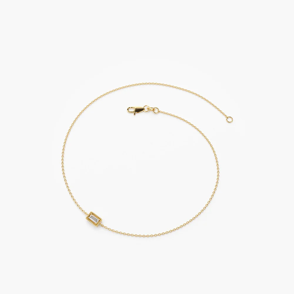 The 14K Gold Dainty Baguette Moissanite Diamond Bracelet is a refined and elegant piece, perfect for adding a subtle touch of luxury to your jewelry collection. Crafted from solid 14K gold in your choice of white, rose, or yellow gold, this bracelet features a brilliant baguette-cut moissanite diamond, offering a sleek and modern aesthetic.