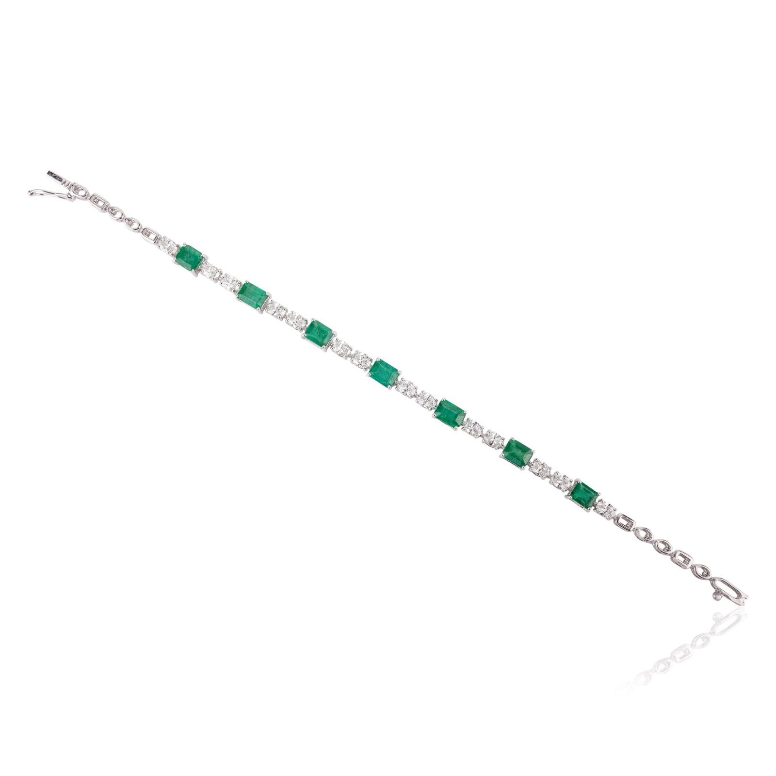 Complementing the emeralds are brilliant diamonds, totaling 2.24 carats. Each diamond, measuring 4 x 3 mm, is expertly set to enhance its natural brilliance and add a touch of sparkle to the bracelet. The combination of emeralds and diamonds creates a harmonious and luxurious design that exudes timeless elegance.