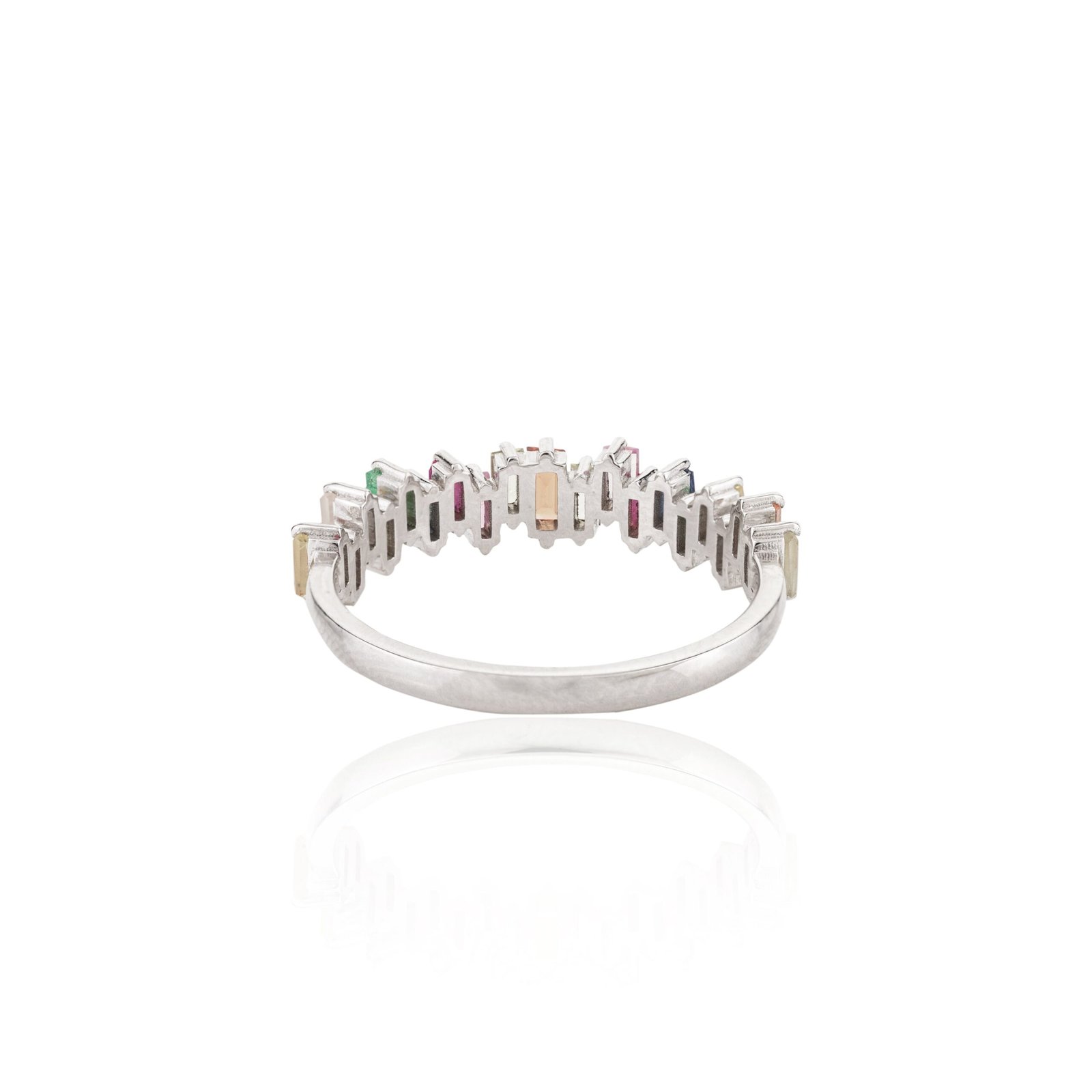 Indulge in the timeless beauty of our 14K Solid Gold Multi Sapphire Eternity Band, a testament to sophistication and luxury. Crafted from high-quality 14K solid  gold, this band features 19 exquisite baguette-cut multi-colored sapphires, totaling 1.29 carats. Each sapphire, measuring 2.8 x 1 mm, displays a blend of colors including deep blues, vibrant yellows, and subtle greens, creating a harmonious and elegant design that captivates the eye.