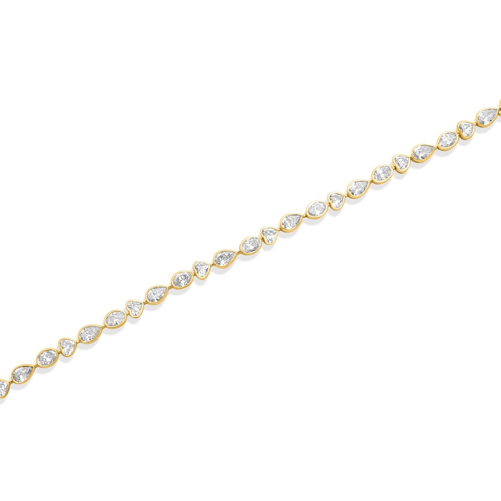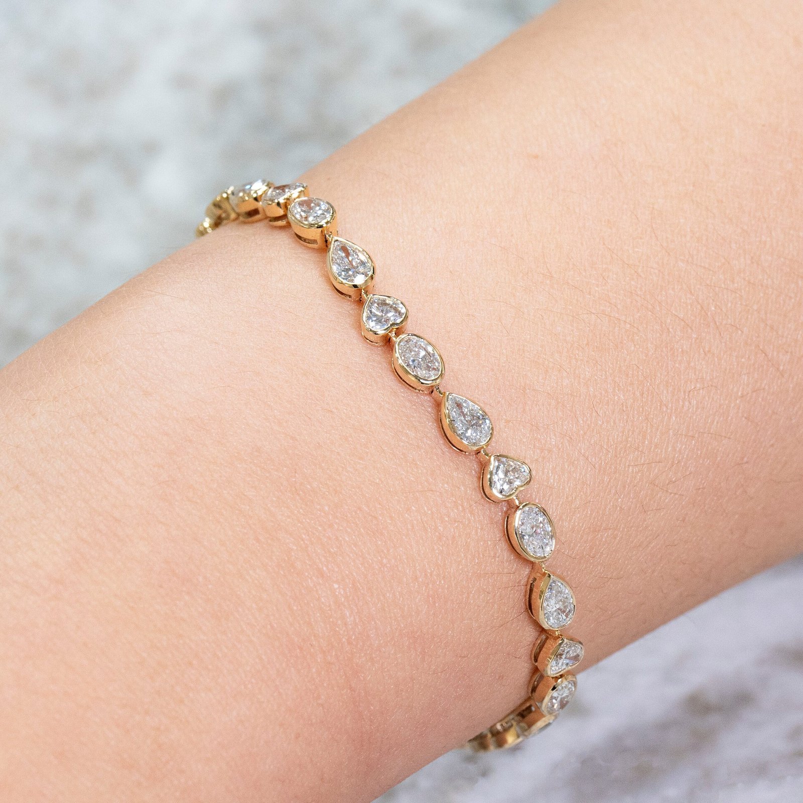 Experience the ultimate elegance with the 14K Gold Multi Shape Bracelet, a breathtaking piece designed to captivate. This luxurious bracelet showcases an exquisite combination of 1.75ct heart-shaped, 2.25ct pear-shaped, and 2.35ct oval Moissanite diamonds, adding up to an impressive total carat weight of 6.35cts. Expertly set in 14K yellow gold, this bracelet offers a harmonious blend of brilliance and sophistication.