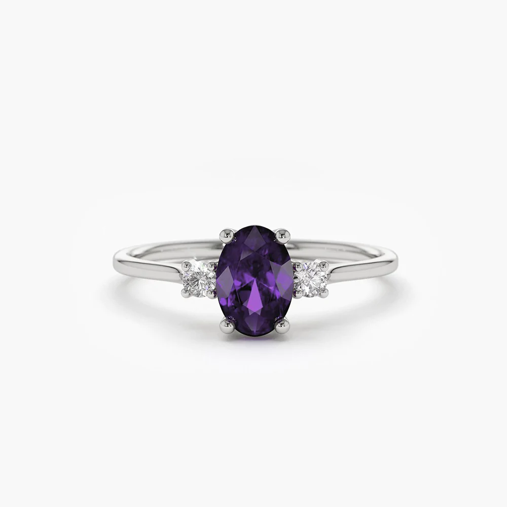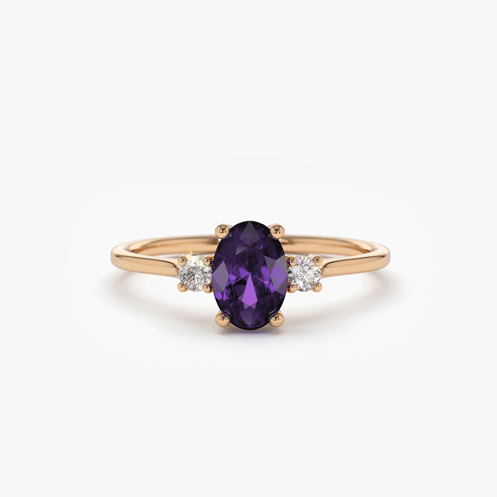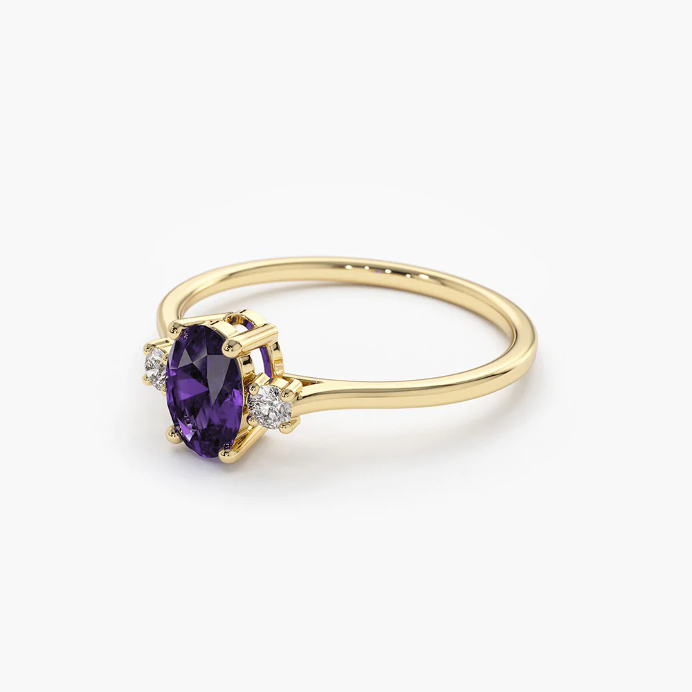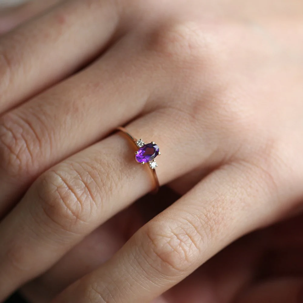 Graceful 14K solid gold ring featuring an oval-shaped amethyst accented with sparkling diamonds—crafted for timeless elegance and vibrant charm.