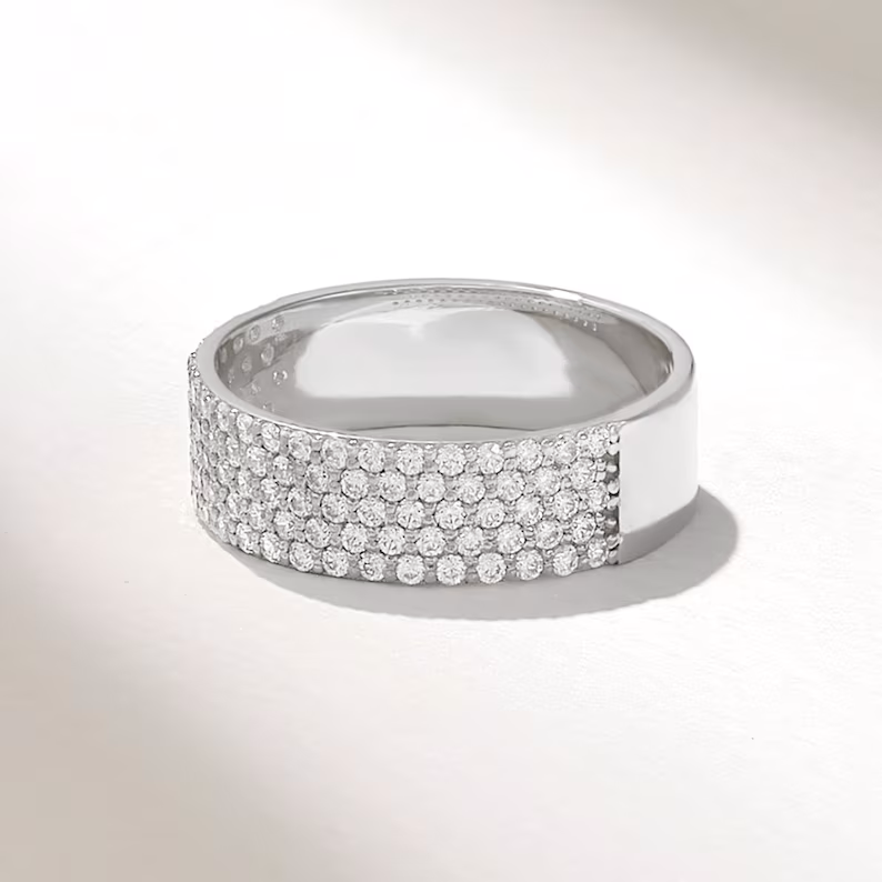 The wide 5.70 mm band is generously adorned with 0.65 carats of natural diamonds, meticulously pave-set across the front half of the ring. These diamonds are of GH color and VS-SI clarity, offering exceptional brilliance and fire with every movement. The 1.20 mm thickness ensures a comfortable fit while maintaining structural integrity and a sleek, contemporary profile.