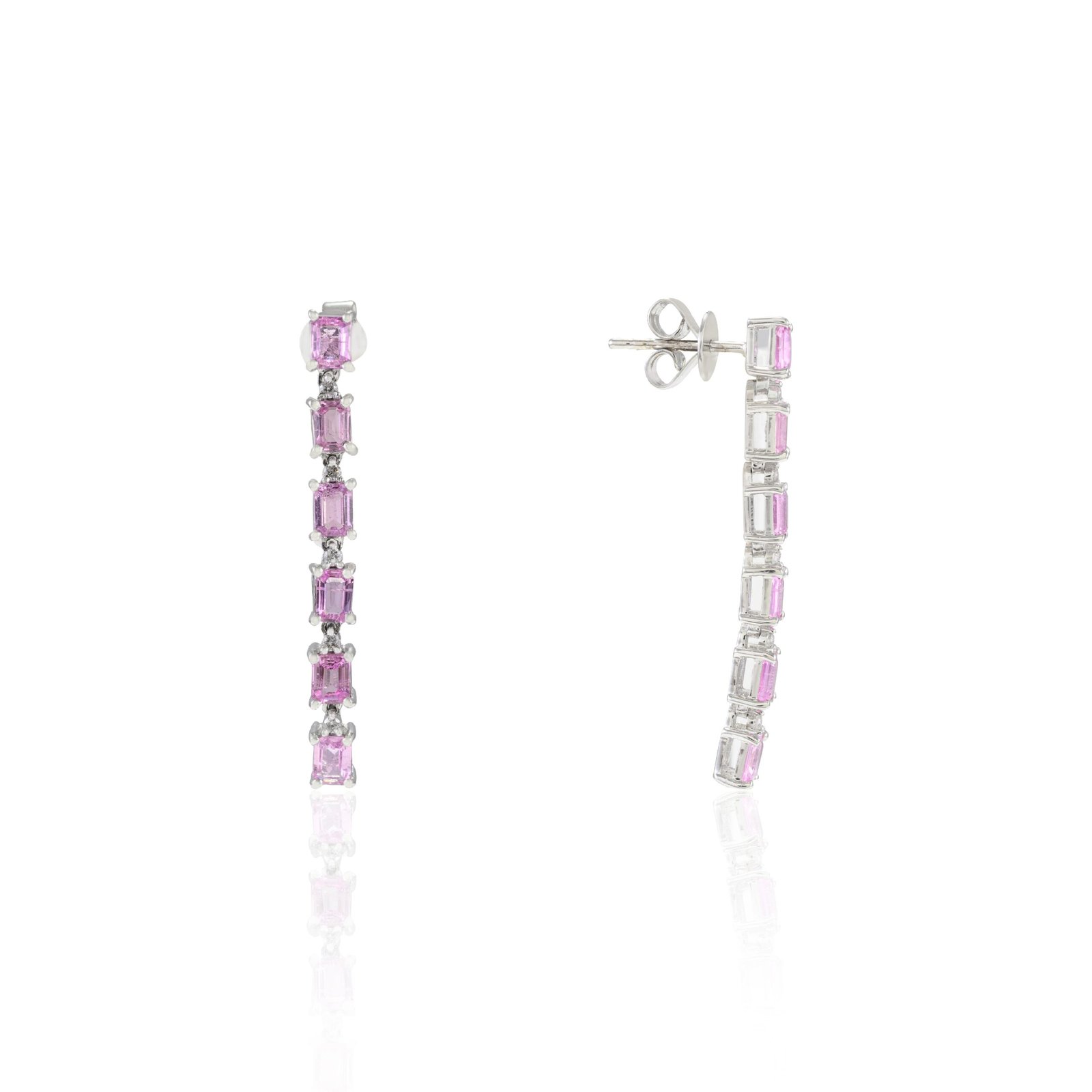 The 14K Solid Gold Pink Sapphire Diamond Cocktail Earrings are a stunning and sophisticated addition to any jewelry collection. Crafted from 14K solid gold, these earrings showcase 2.53 carats of vibrant octagon-shaped pink sapphires, each measuring 4 x 3 mm. The pink sapphires are beautifully complemented by 0.12 carats of sparkling diamonds, meticulously set in a prong setting to enhance their brilliance and create a dazzling effect. With a total of 12 pink sapphires and diamonds measuring 1.2 mm each, these earrings provide a luxurious and eye-catching appearance. The gross weight of 4.782 grams ensures they are substantial yet comfortable for all-day wear. The push back lock mechanism offers a secure and easy-to-wear design, making these earrings perfect for both special occasions and everyday elegance. The combination of the rich pink sapphires and sparkling diamonds in a classic white gold setting creates a timeless piece that will be cherished for years to come. Ideal as a gift for a loved one or a sophisticated addition to your own collection, the 14K Gold Pink Sapphire Diamond Cocktail Earrings are a testament to fine craftsmanship and exquisite design, adding a touch of luxury and elegance to any outfit.