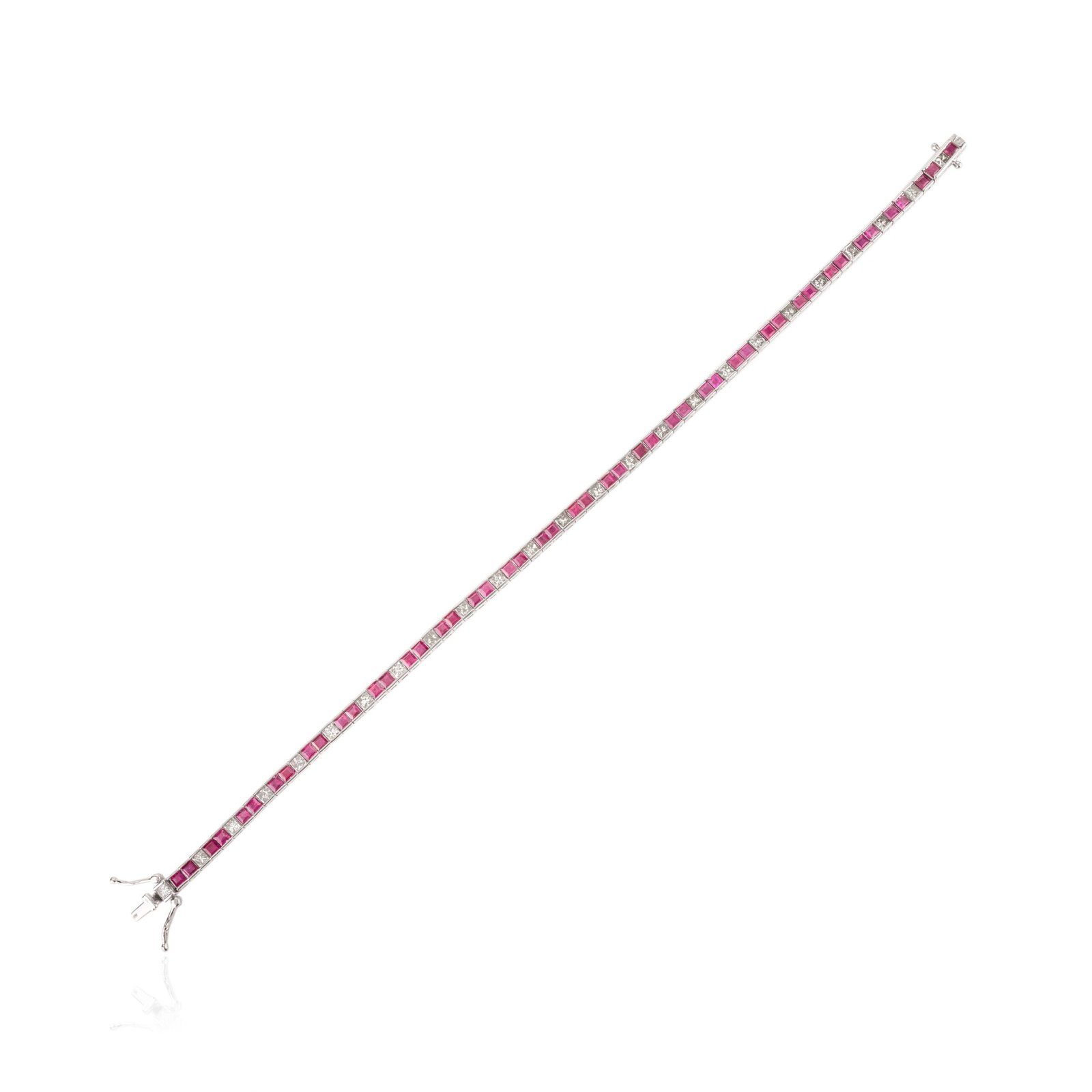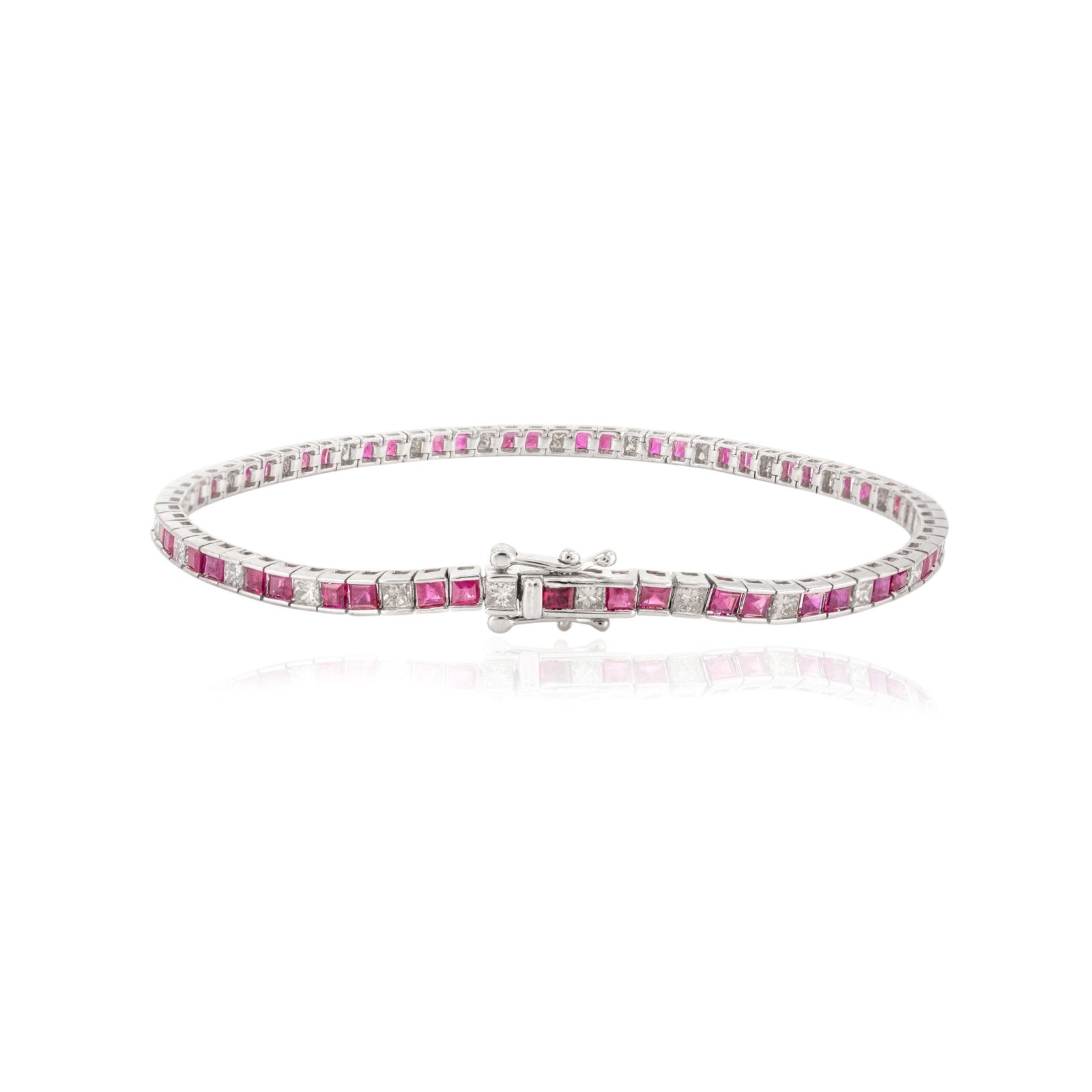 The square rubies, totaling 3.36 carats and sized at 2.5 mm each, exhibit a deep, luxurious red hue that signifies passion and elegance. Complementing these vibrant gemstones are round diamonds, totaling 1.68 carats with a size of 2.5 mm each. These diamonds are meticulously set to maximize their brilliance and sparkle, enhancing the overall allure of the bracelet.