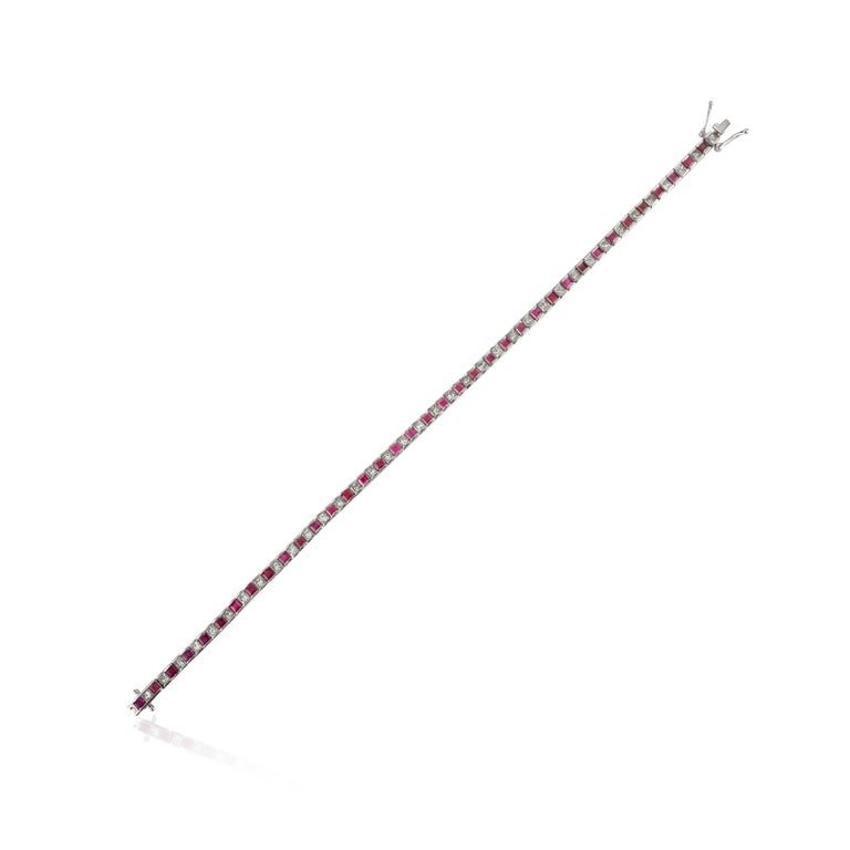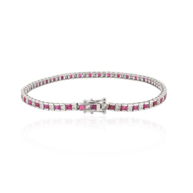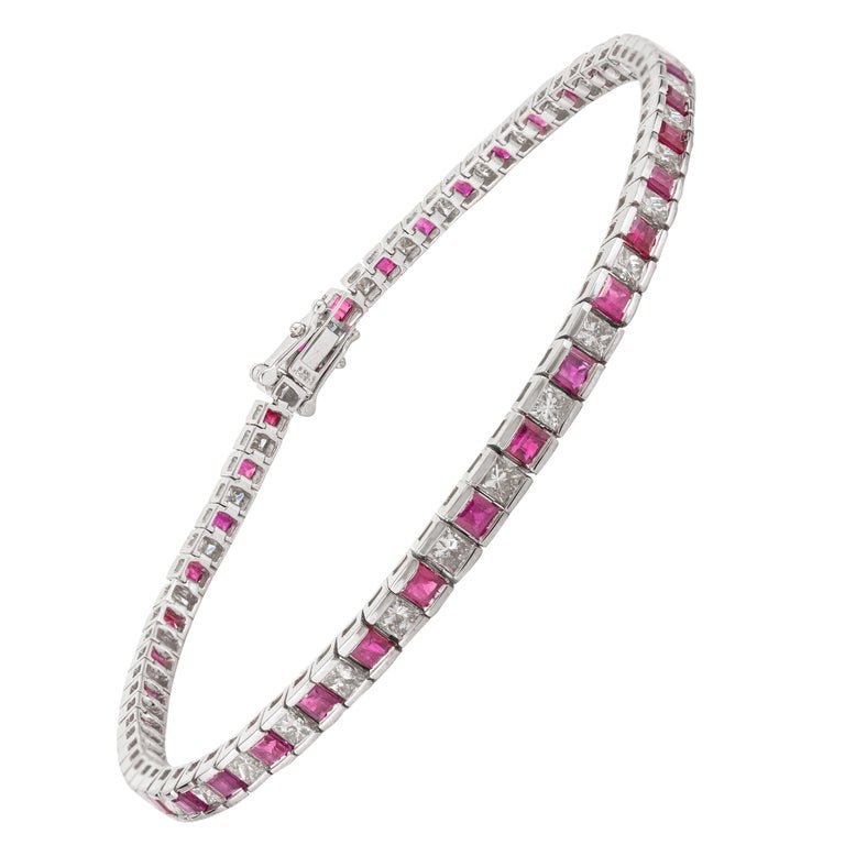 The princess-cut rubies, totaling 3.41 carats and measuring 3 mm each, exhibit a rich red hue that symbolizes passion and vitality. Set alongside them are round diamonds, totaling 2.28 carats, which add brilliance and sparkle to the bracelet. These diamonds, measuring 3 mm each, are meticulously set in a classic design that ensures each stone is securely held while allowing light to enhance their brilliance.