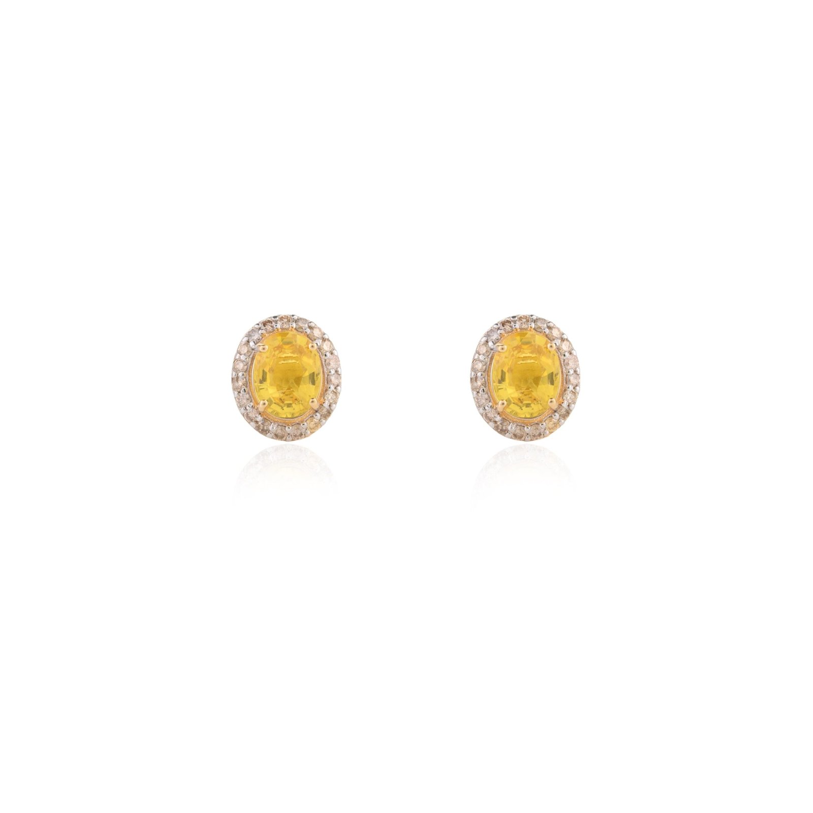The earrings feature two oval yellow sapphire gemstones, each weighing 0.565 carats and measuring 5.5 x 4.5 mm, complemented by a total diamond weight of 0.23 carats. Set in 14K solid yellow gold, these elegant earrings are designed with prong settings that enhance the gemstones’ natural brilliance.
