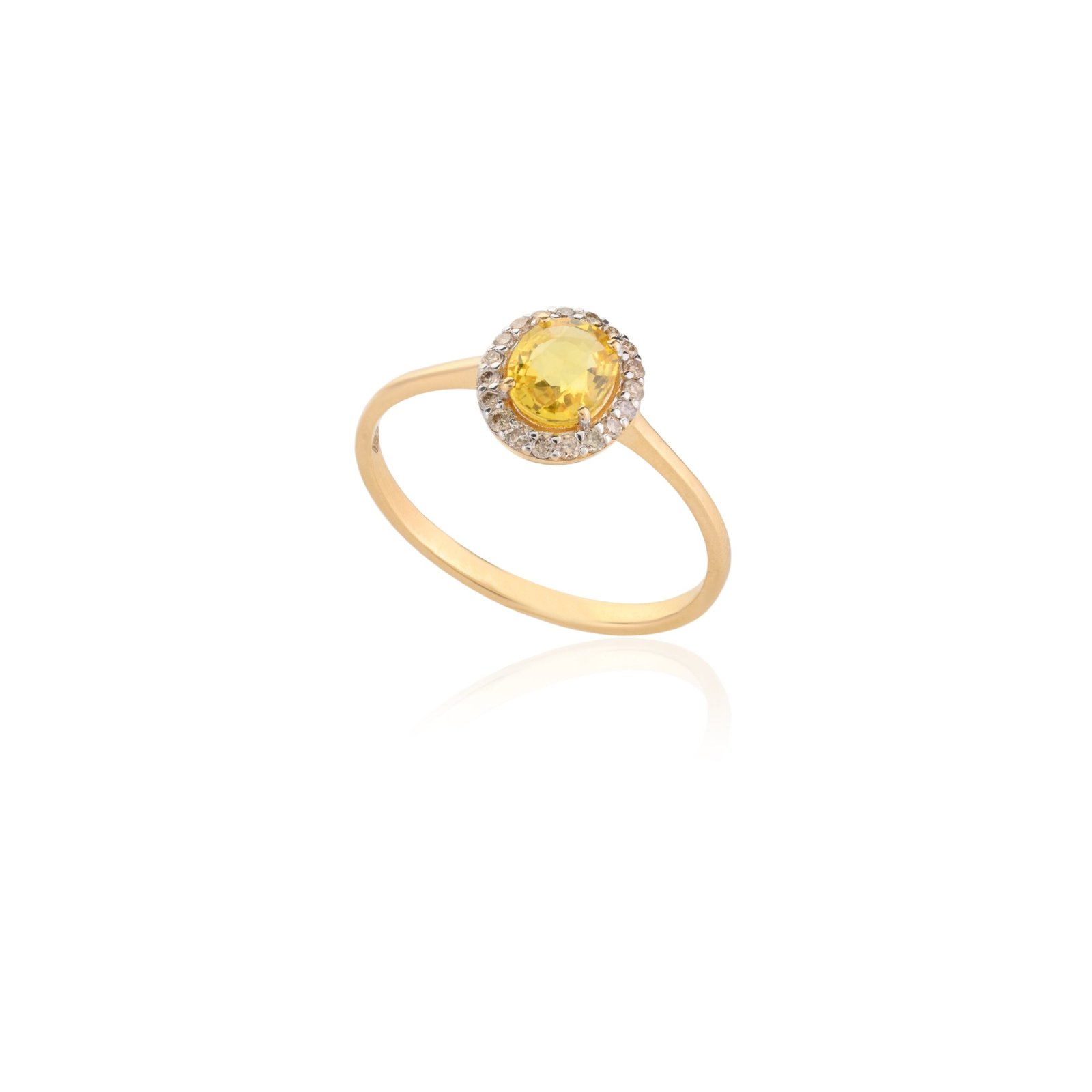 The ring features a single oval yellow sapphire gemstone, weighing 0.56 carats and measuring 5.5 x 4.5 mm, complemented by a 0.12 ct diamond. Set in 14K solid yellow gold, this elegant ring is designed with a prong setting that enhances the gemstones’ natural brilliance.