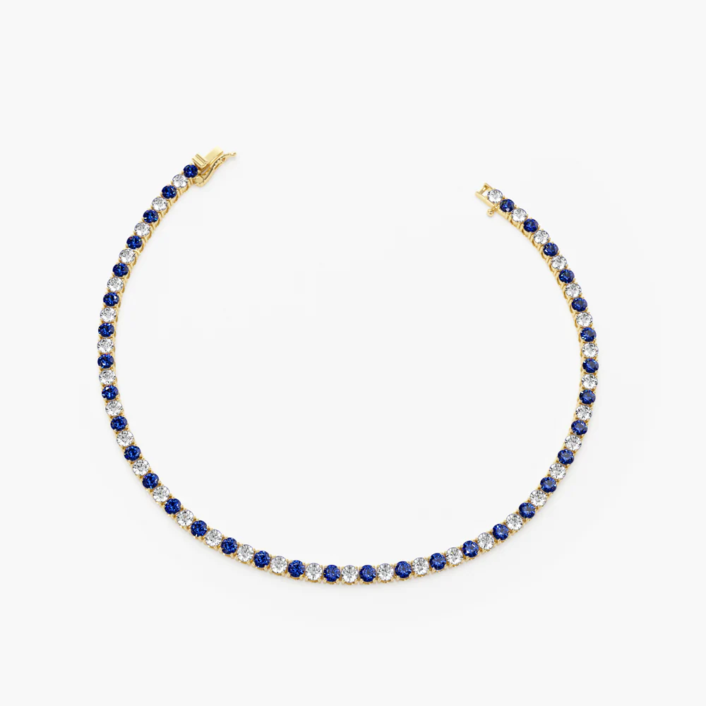 Timeless 14K solid gold tennis bracelet featuring prong-set diamonds and sapphires—crafted for classic elegance, sparkle, and rich blue charm.