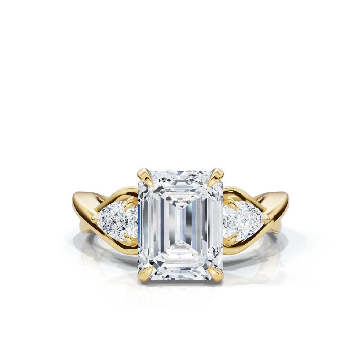 The 14K Solid Gold Three Stone Pear Lab Grown Diamond Engagement Ring features a 2ct emerald-cut center diamond with 0.57ct pear-shaped side diamonds, set in 14K gold (White, Rose, or Yellow).