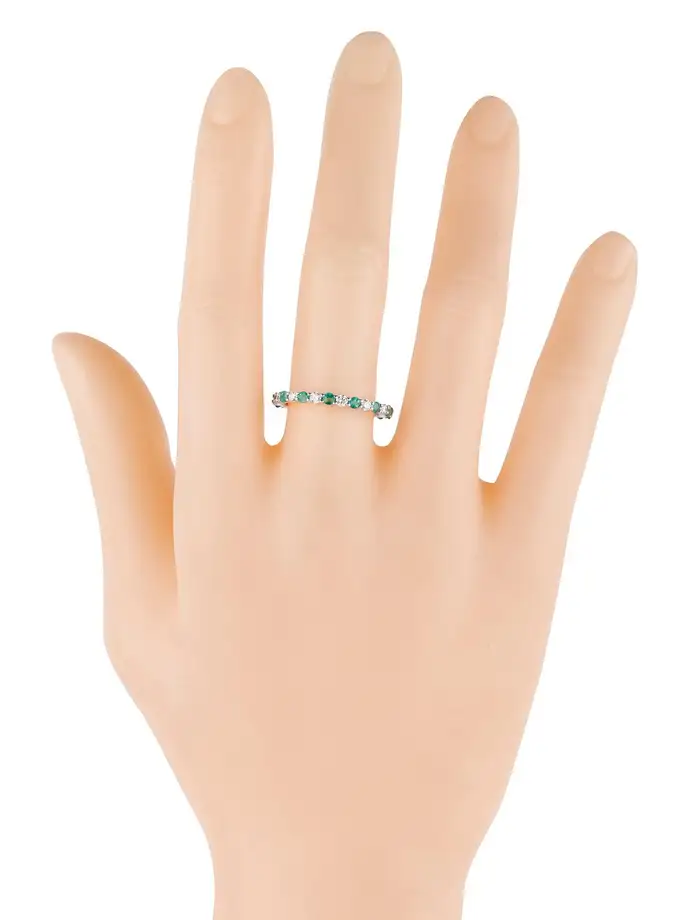Ideal as a wedding band, anniversary gift, or stacking ring, this eternity band is both versatile and meaningful. The full-circle setting represents an unending bond, while the combination of diamonds and emeralds creates a stunning contrast that captures attention without overpowering. Designed for comfort and elegance, the ring sits beautifully alone or stacked with other fine bands.