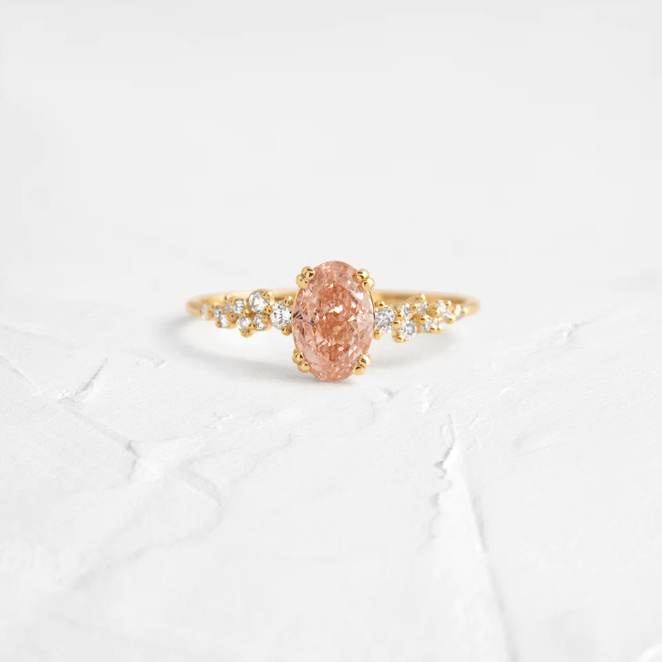 The centerpiece of this stunning ring is a 1ct. lab-grown pink diamond, famous for its vibrant color and exceptional clarity.