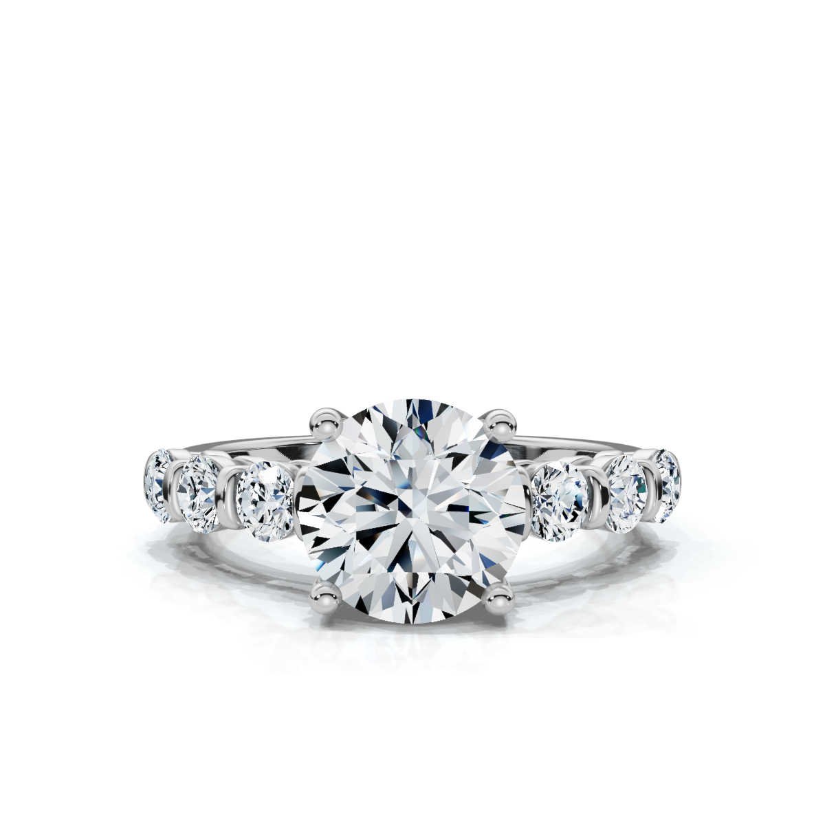 A stunning 2.1Ct lab-grown diamond engagement ring set in 14K solid gold. Features a 2Ct F color, VS2 clarity center stone and six round-cut side diamonds (0.6CTW). Available in white, rose, and yellow gold with a comfort-fit band.