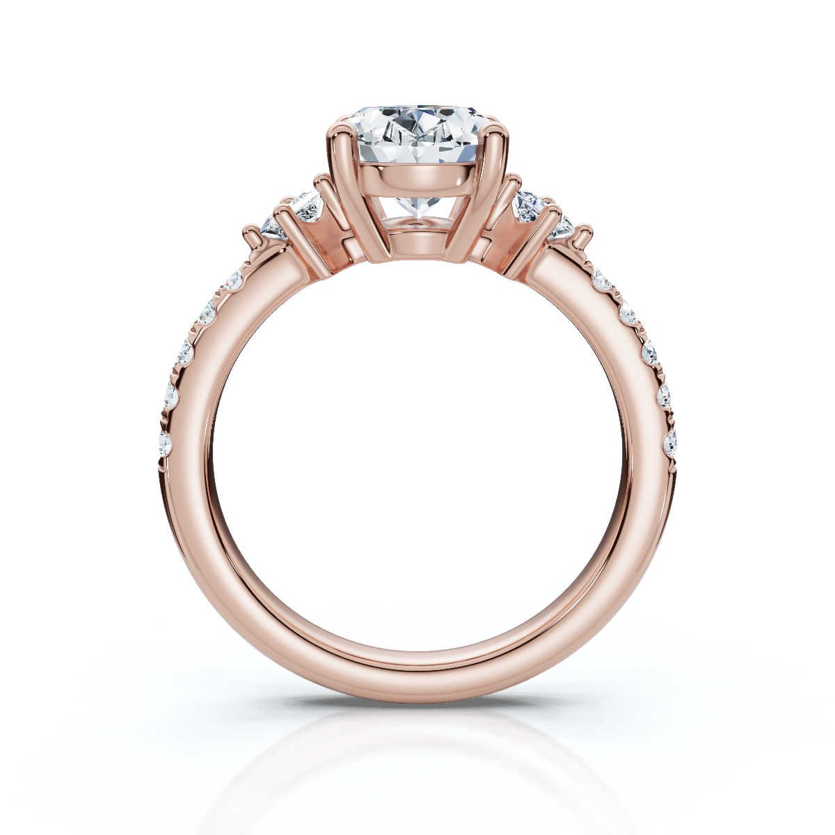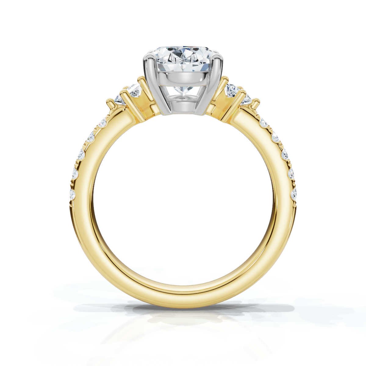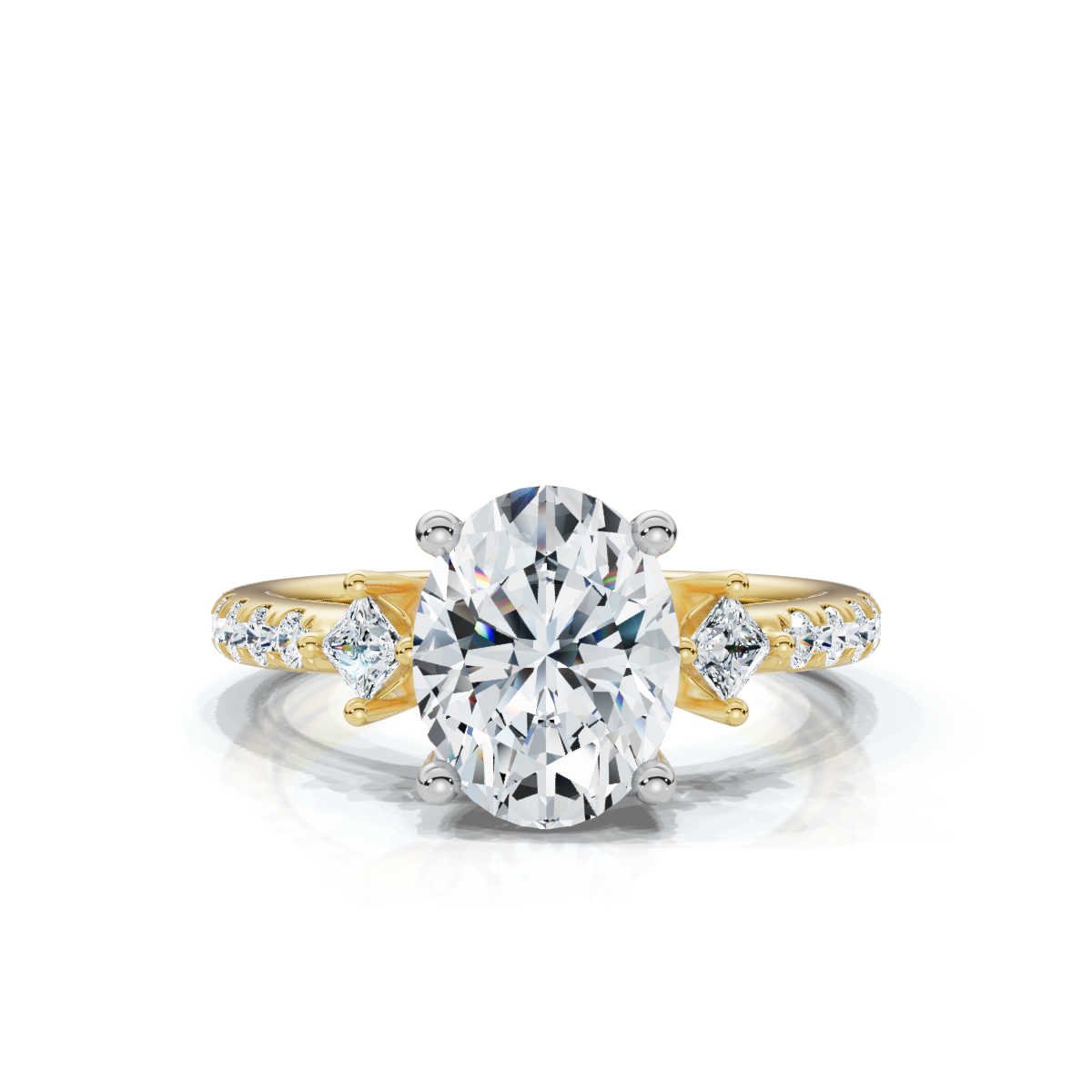A 2ct oval-cut Moissanite solitaire ring, adorned with 0.35ct round and princess-cut diamonds, set in 14K solid gold with a sleek, elegant band.