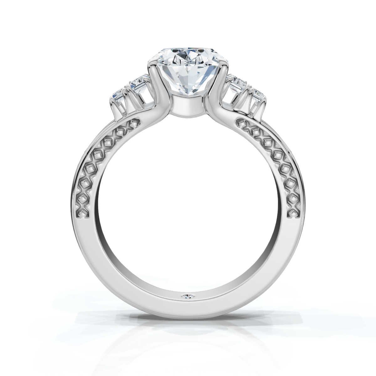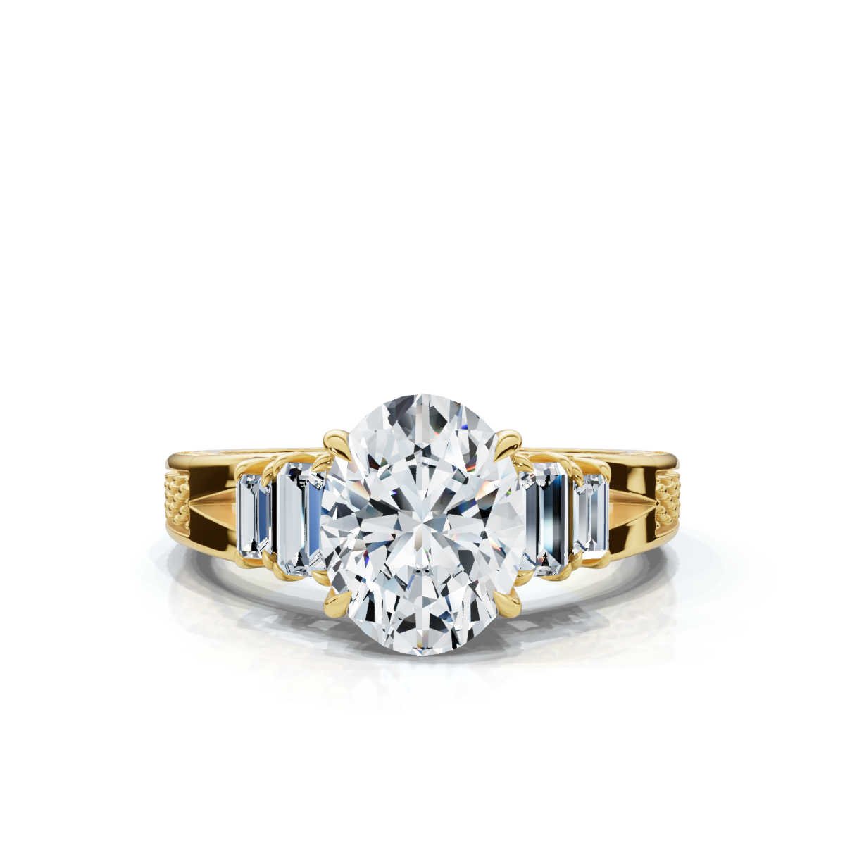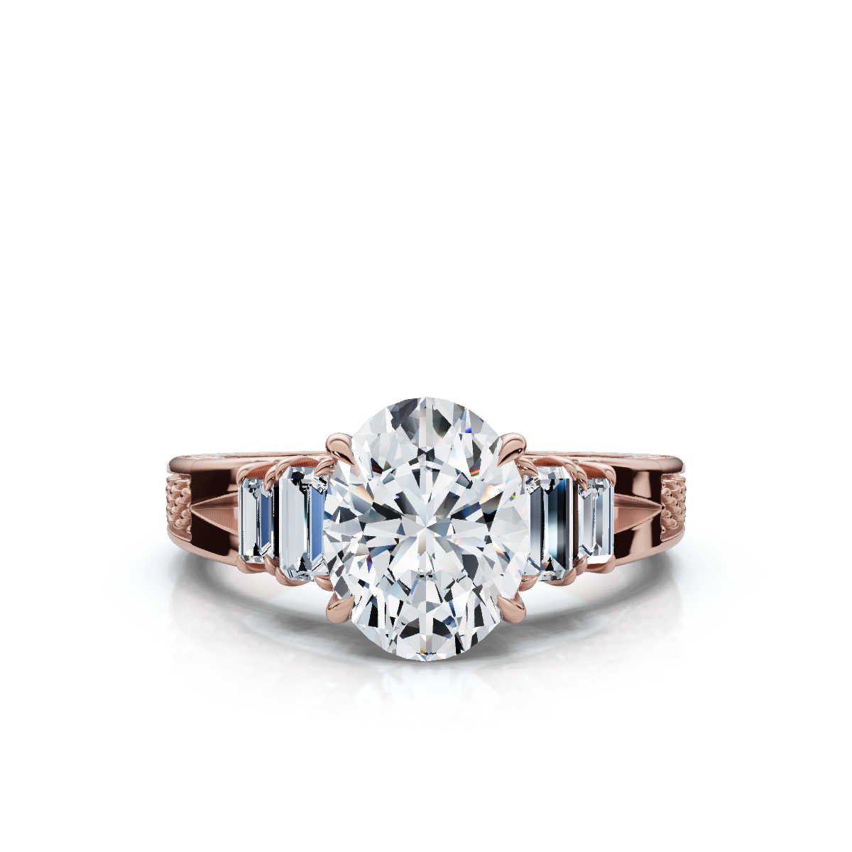 A 2.4CT Moissanite engagement ring with a 2ct oval solitaire and 0.43ct side diamonds in 14K solid gold. Available in White, Rose, and Yellow Gold. GRA certified.