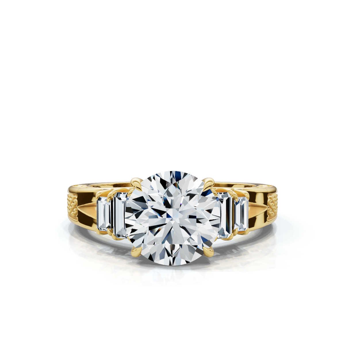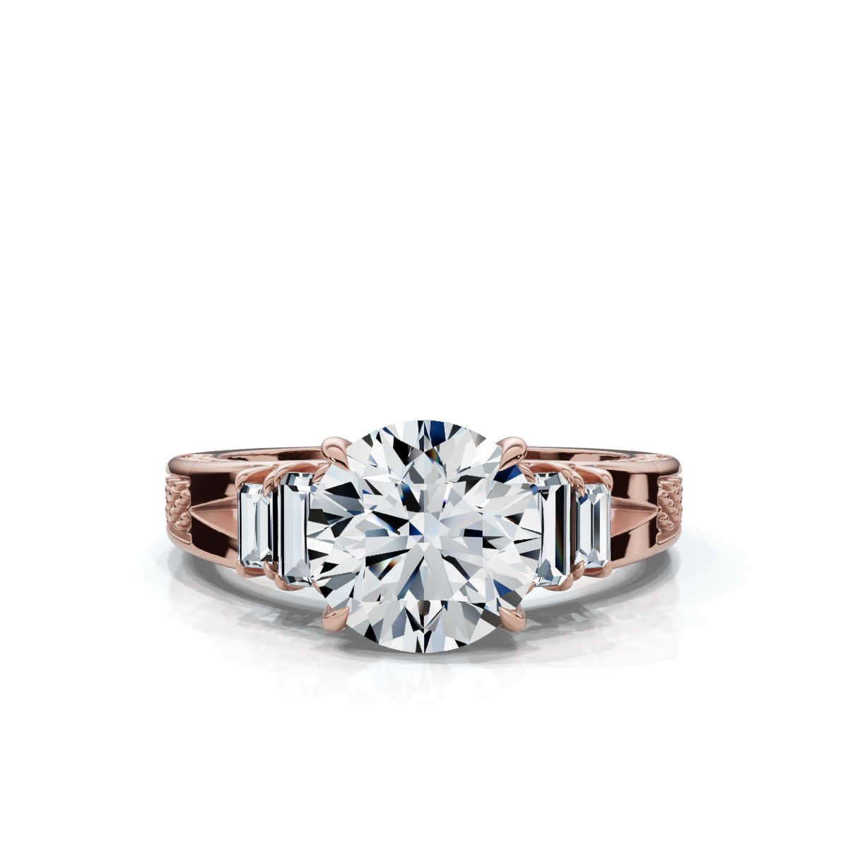 - Side Stone Shape: Round, Baguette