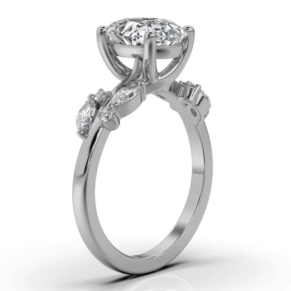 Accentuating its beauty, eight side Moissanite diamonds in a mix of round and marquise shapes (totaling 0.46ct) add dimension and brilliance to the design. Set in a secure prong setting, these stones enhance the ring’s captivating appeal.
