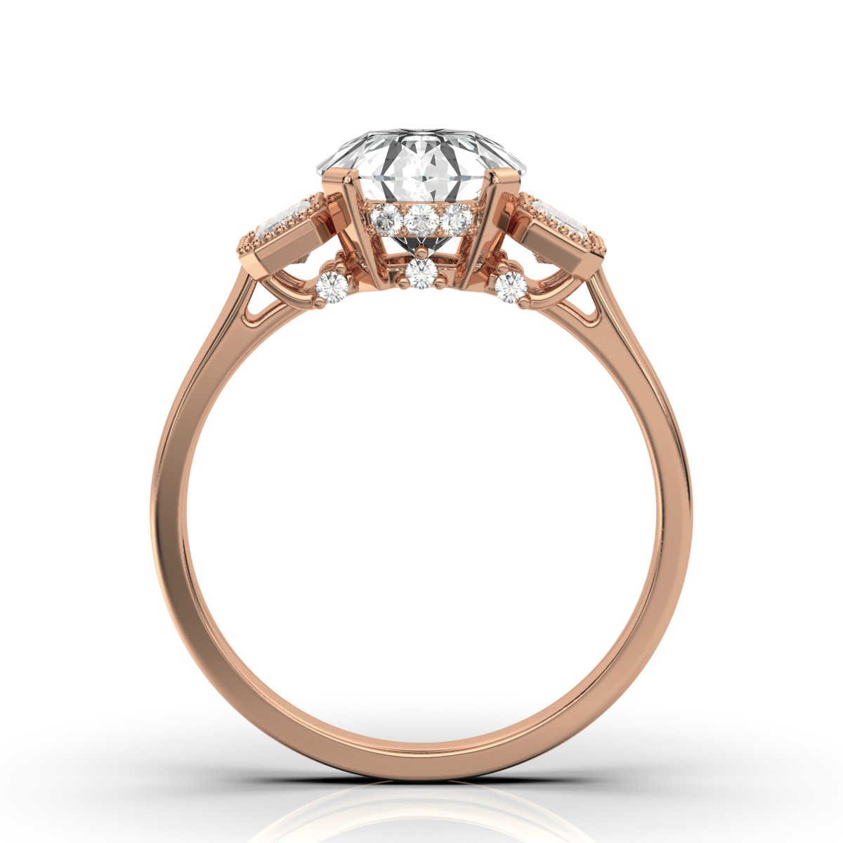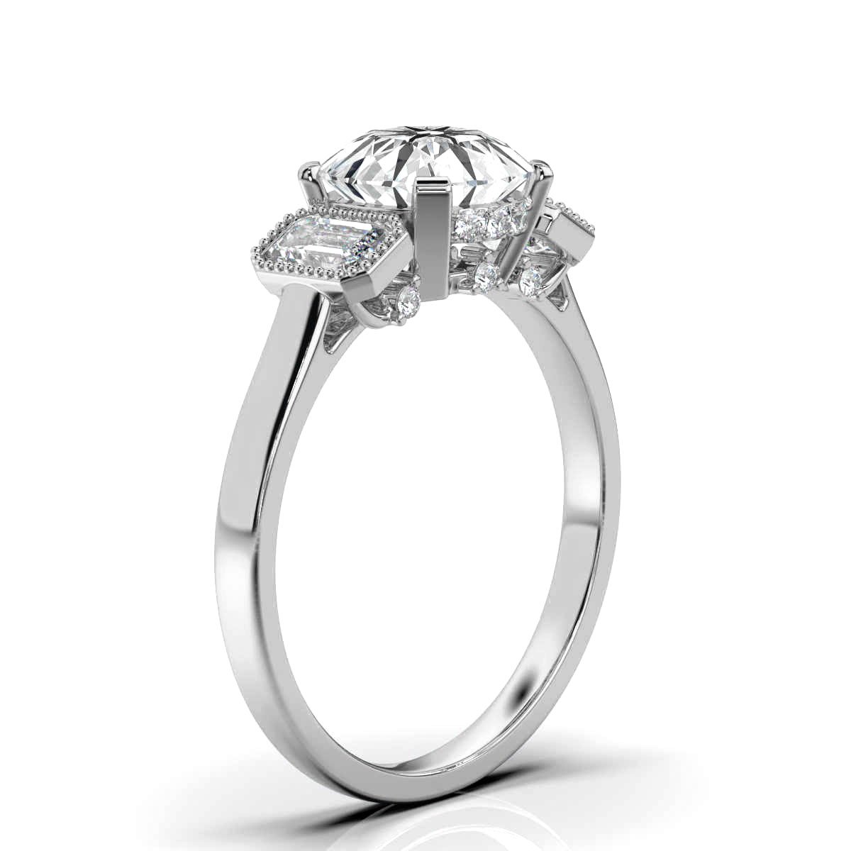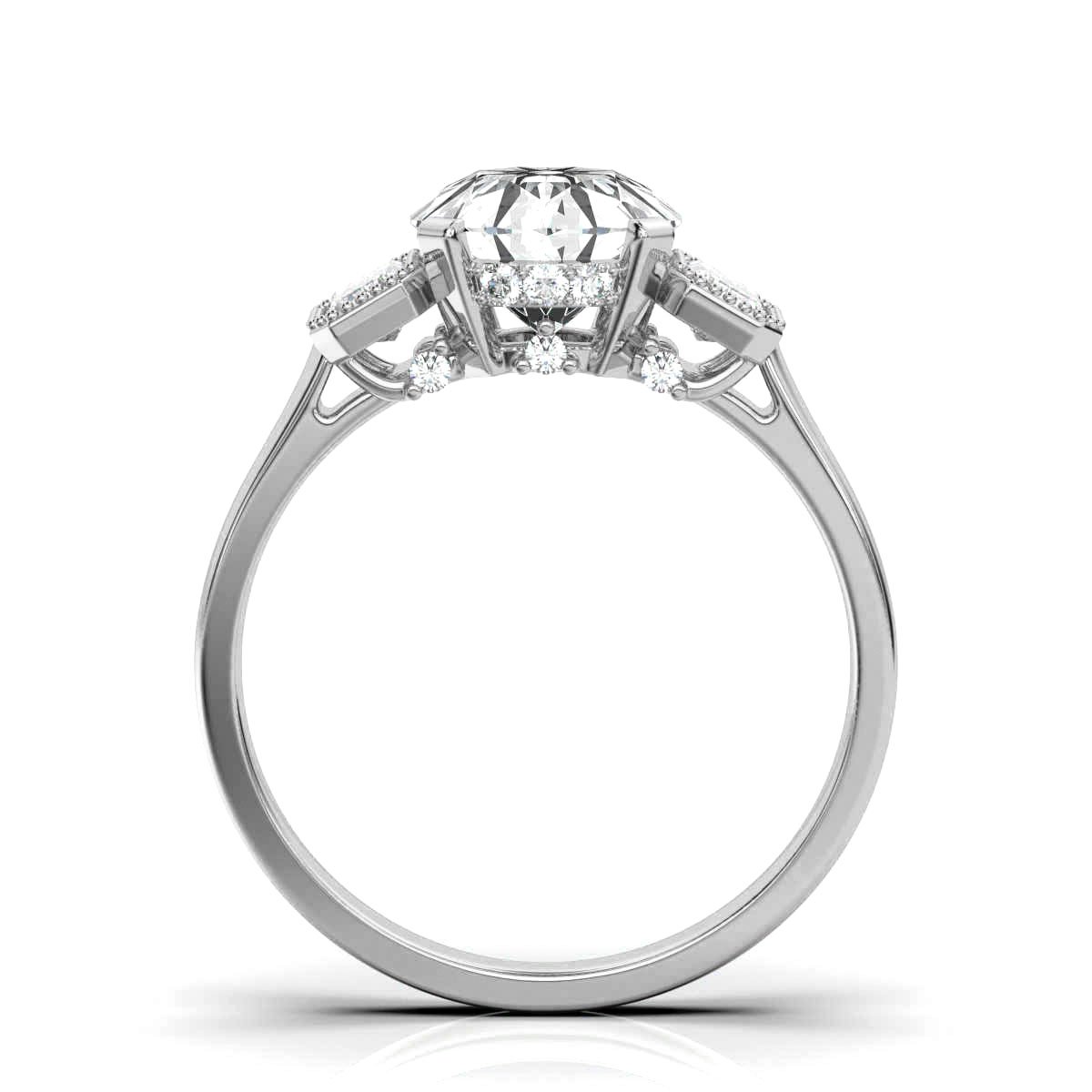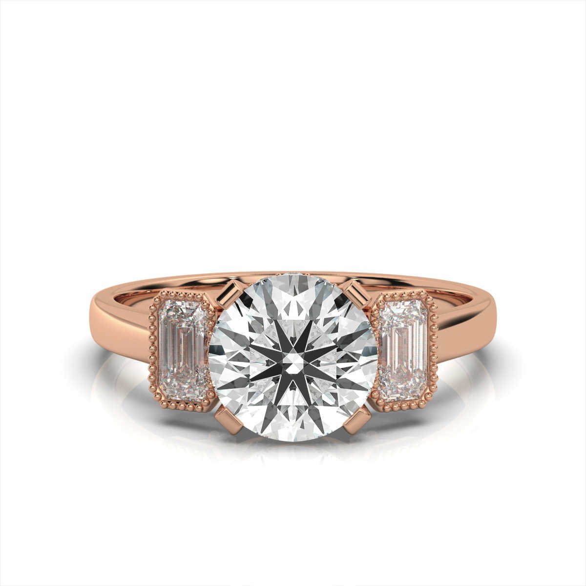 The 14K Solid Gold 2.5ct Three Stone Lab Grown Diamond Ring features a 2ct round center diamond with 0.45ct side diamonds in round and emerald shapes.