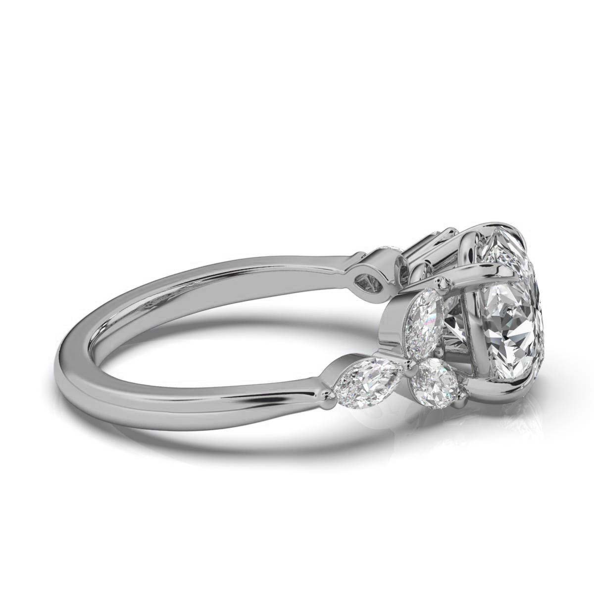 Adding to the allure of this ring are 6 marquise-shaped side diamonds, totaling 0.63ct. These side stones, all lab-grown, complement the central diamond beautifully, creating a harmonious and refined look. The side diamonds are also graded F color and VS2 clarity, matching the center stone’s brilliance and offering even more sparkle to the overall design.